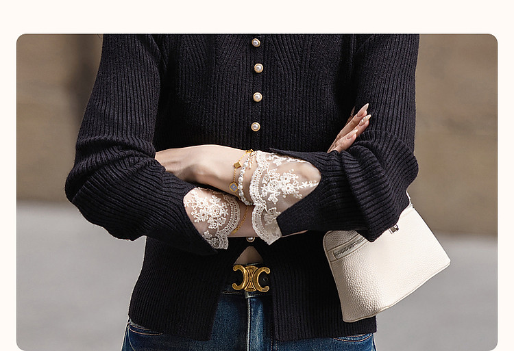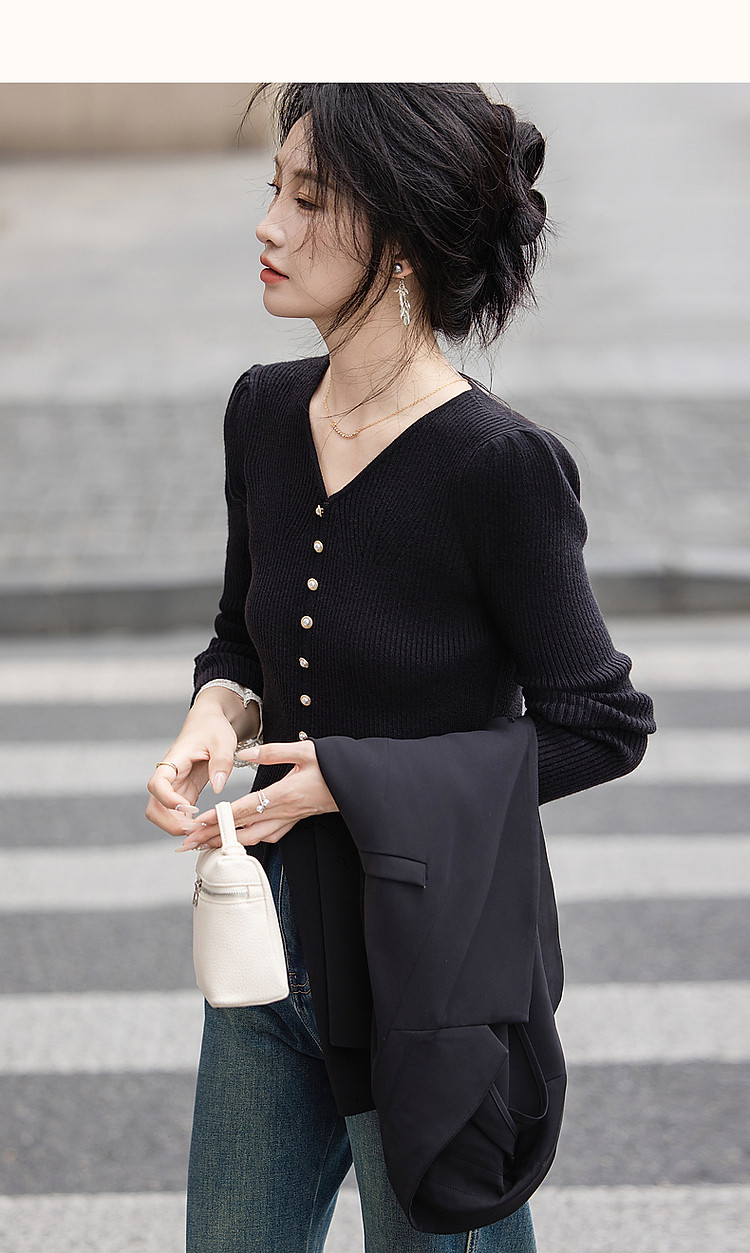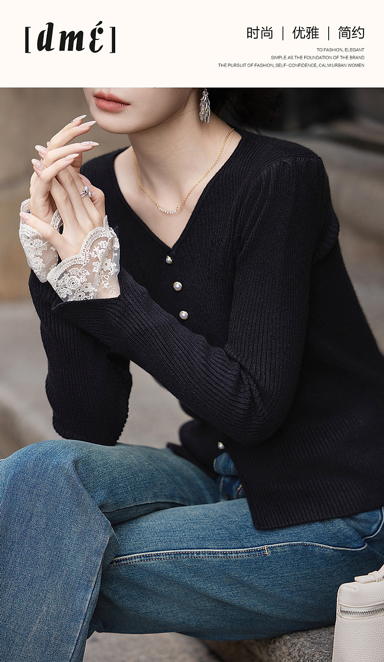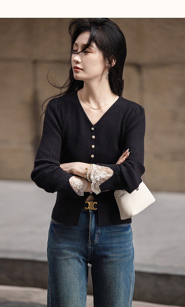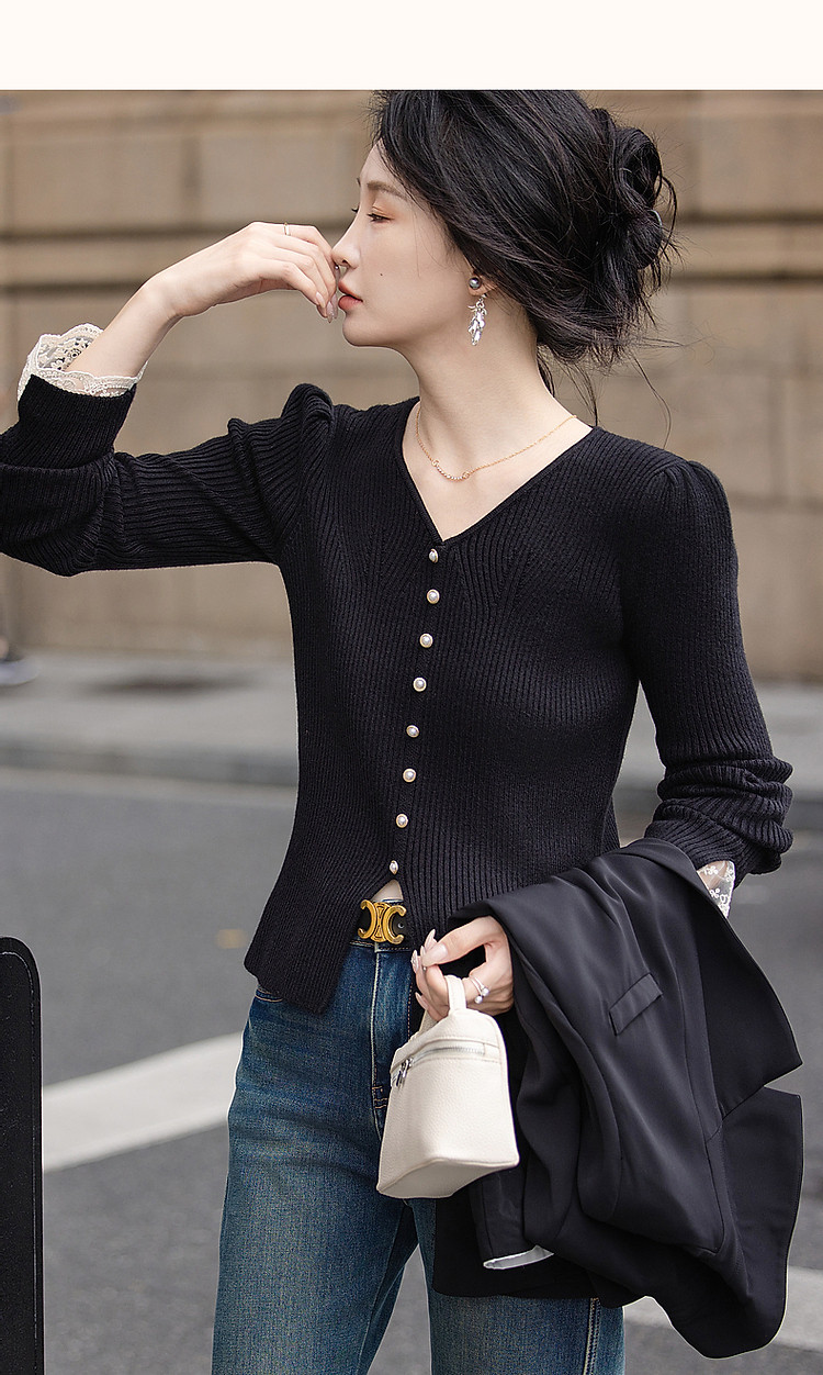 【舒适纤绒纱】秋法式V领泡泡袖蕾丝花边线衫开叉针织衫女上衣 231745