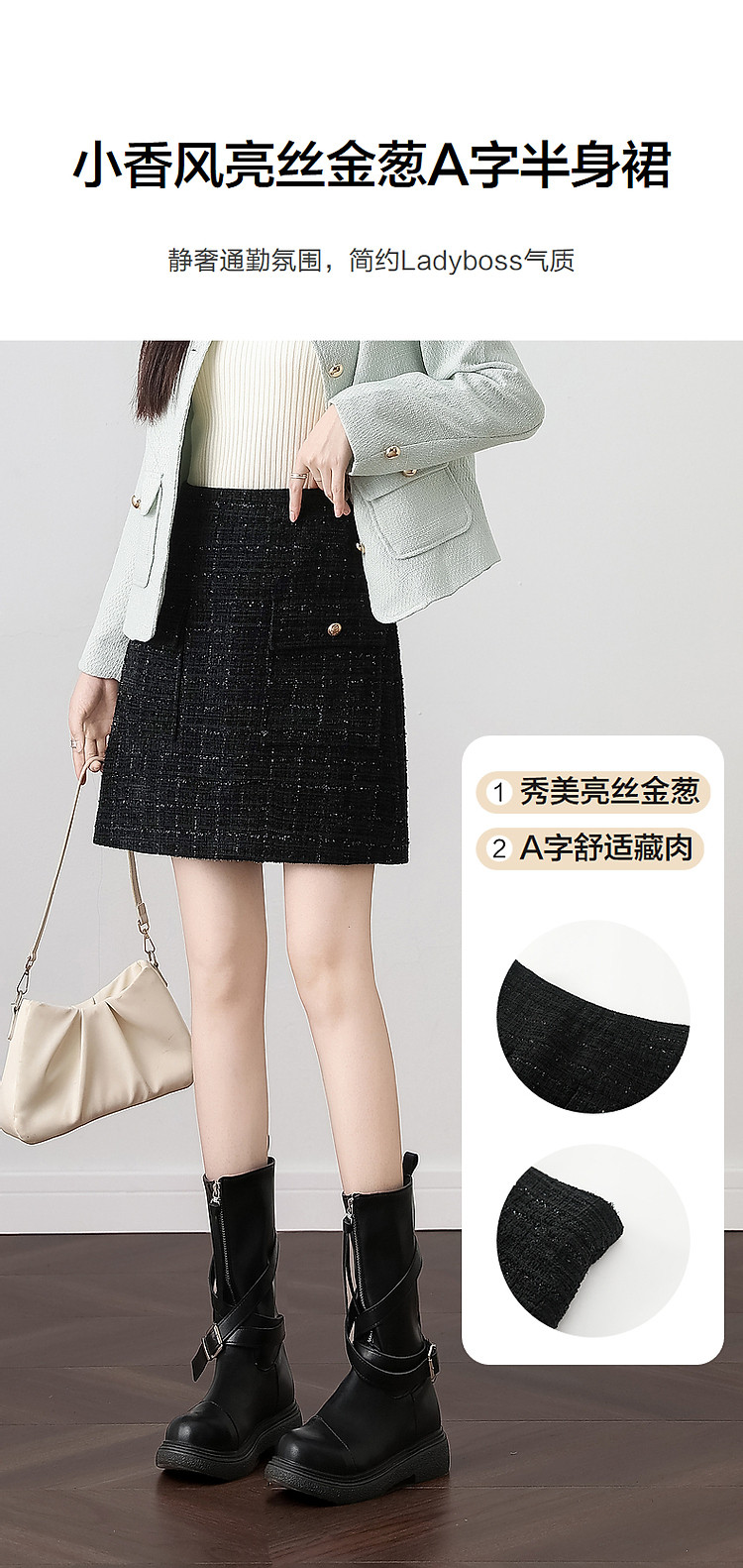 【结构主义】秋小香风亮丝金葱口袋A字藏肉半身裙女短款 279489