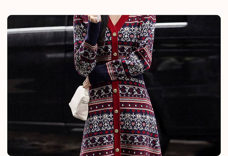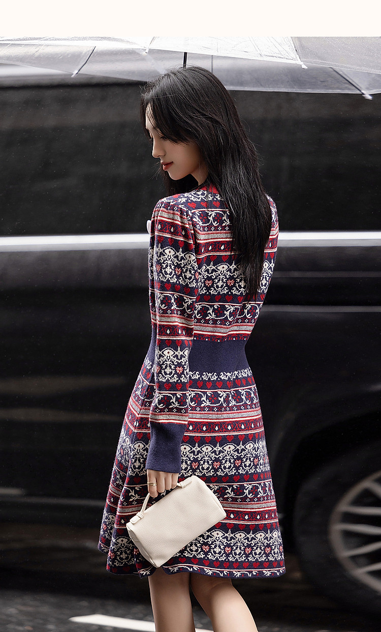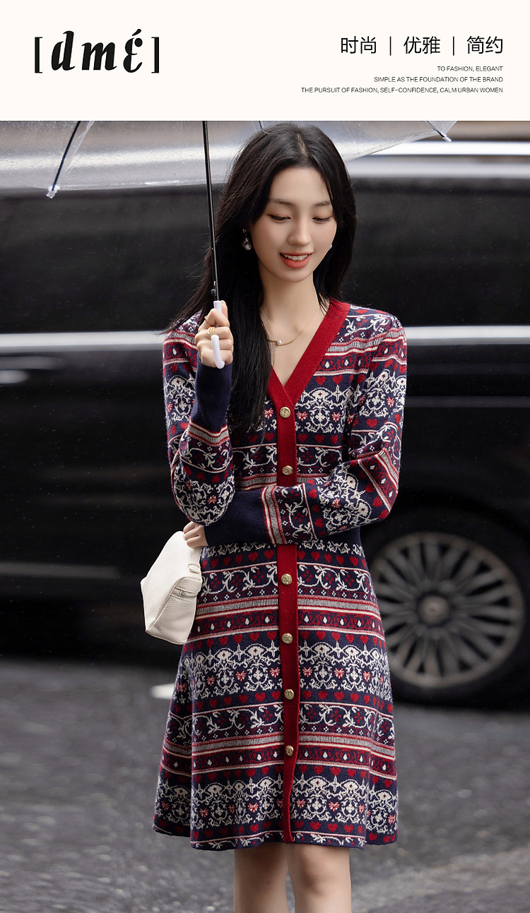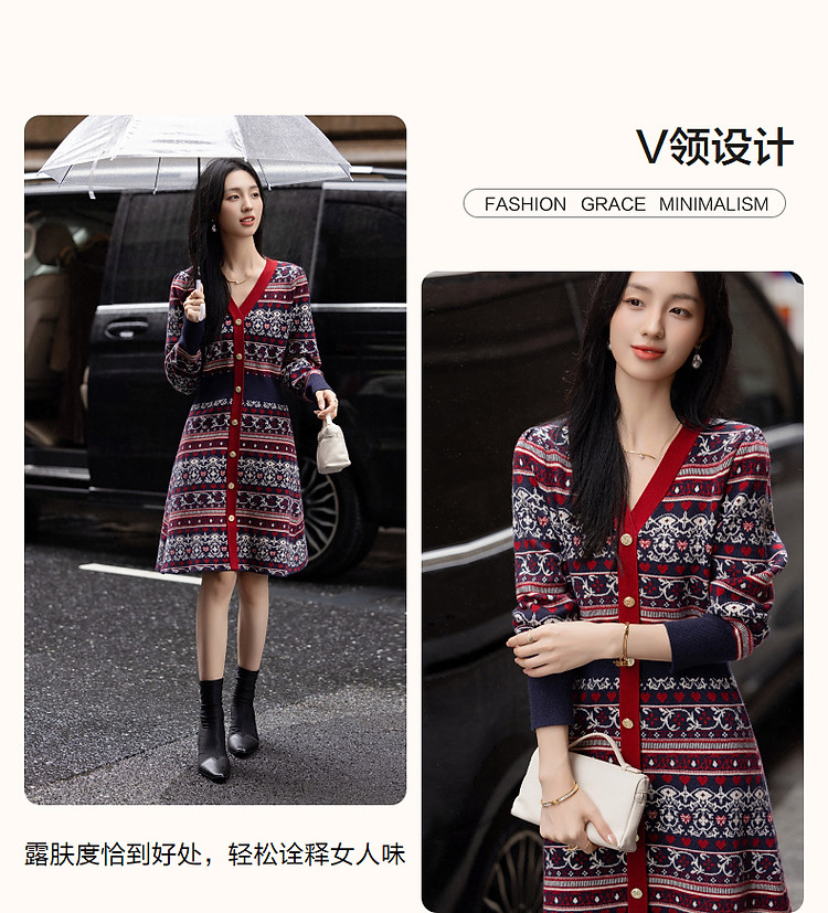 商品名称:【慵懒富美】秋季高频好穿纤绒纱V领撞色提花收腰遮肉女式连衣裙 019073