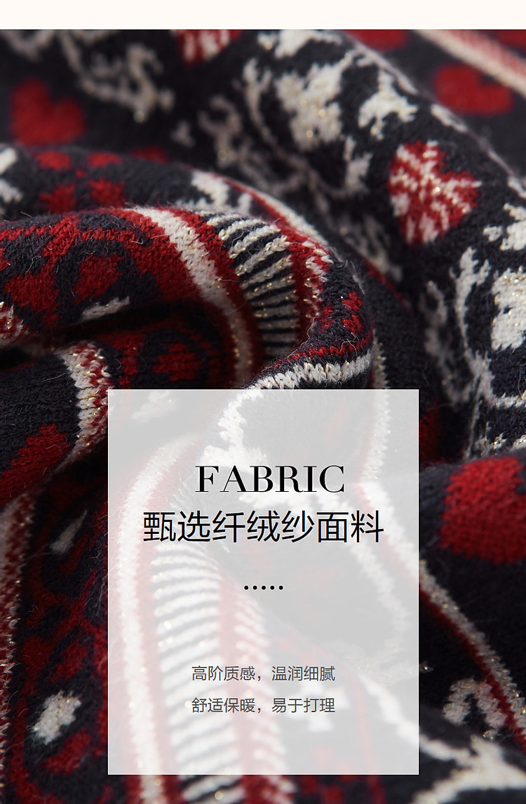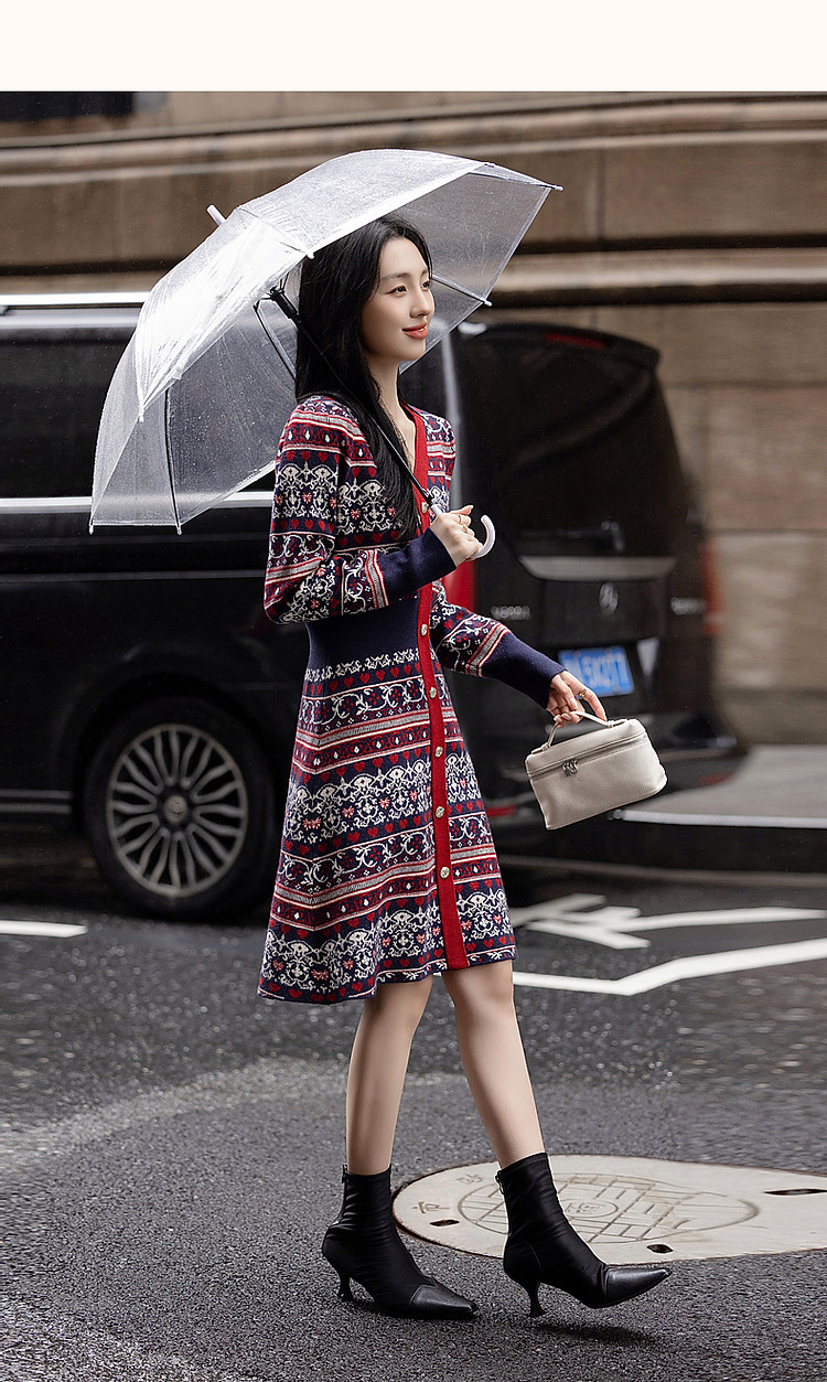 【慵懒富美】秋季高频好穿纤绒纱V领撞色提花收腰遮肉女式连衣裙 019073