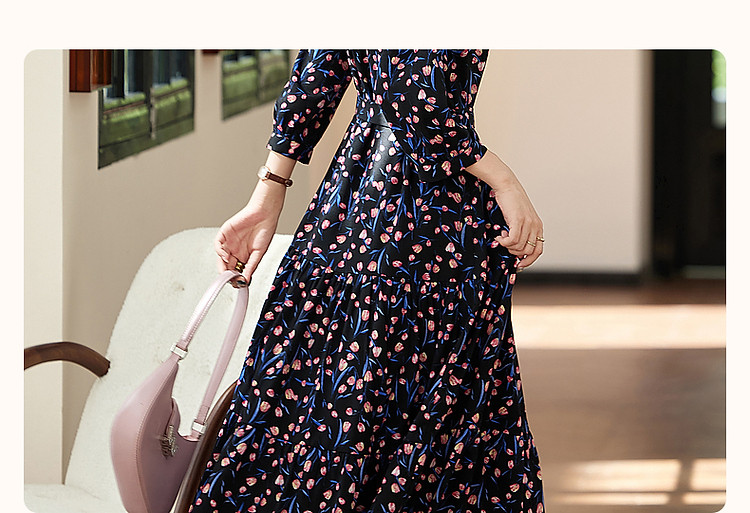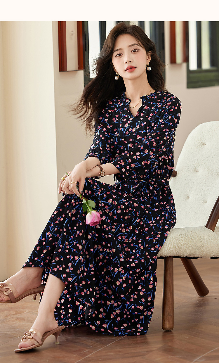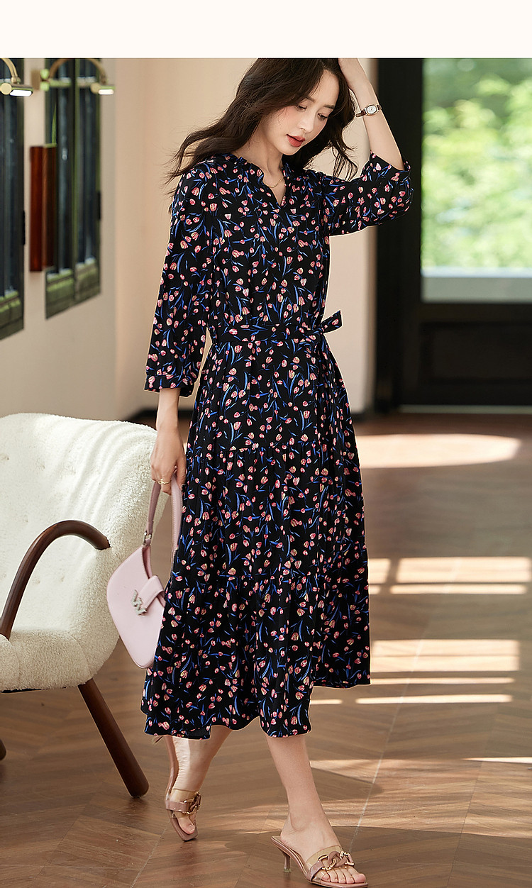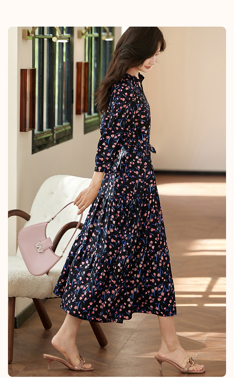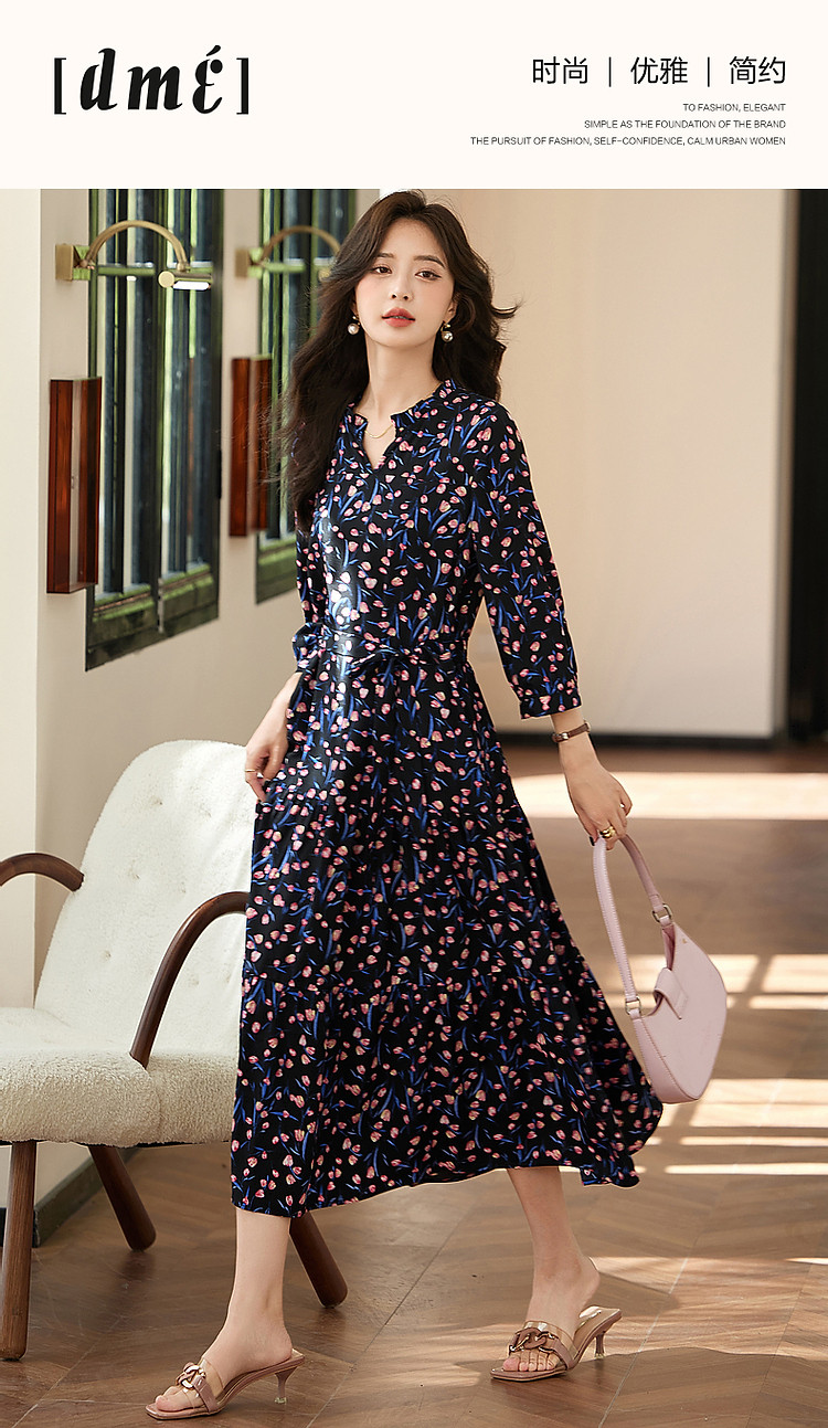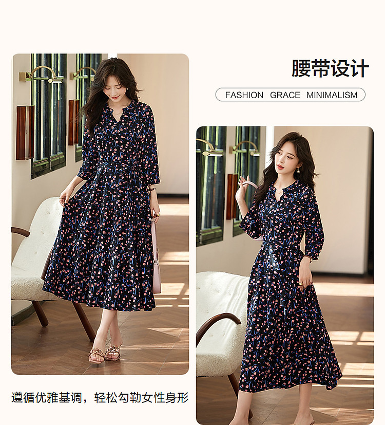 商品名称:【植物系氧气名媛】法式郁金香碎花茶歇裙花边领腰带连衣裙女长款 649409