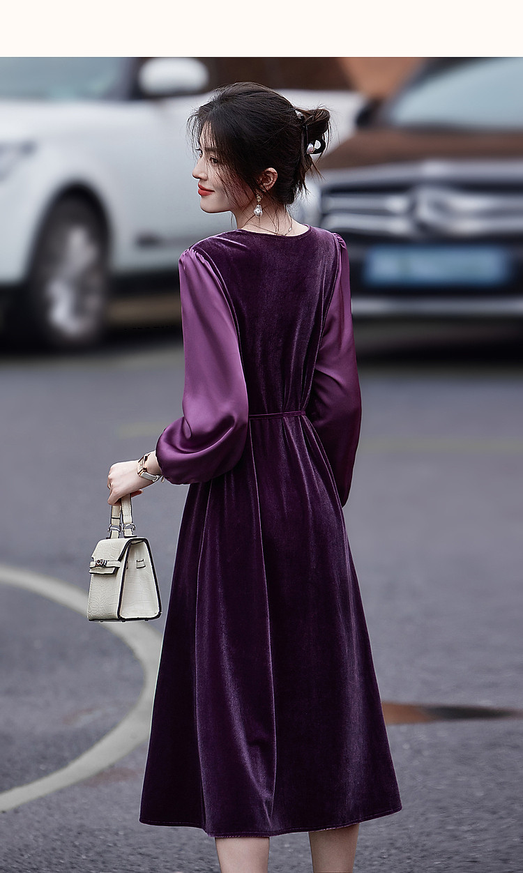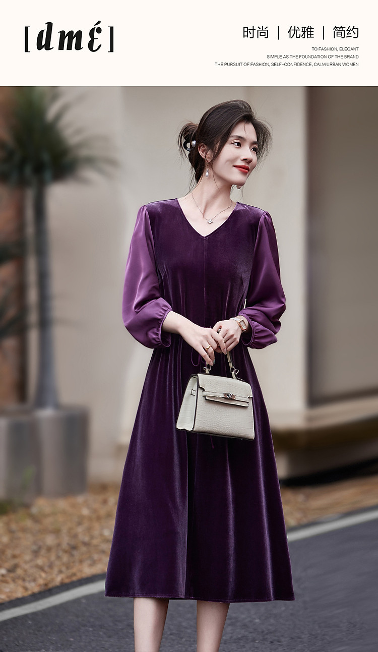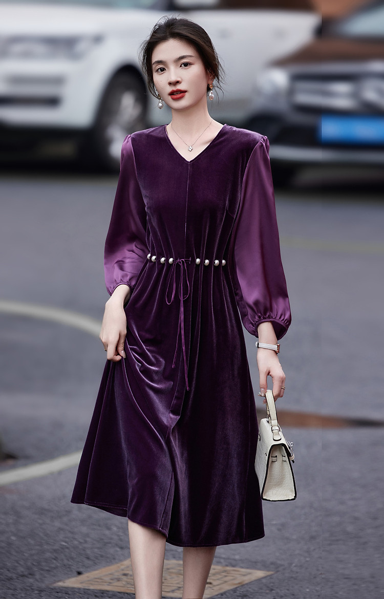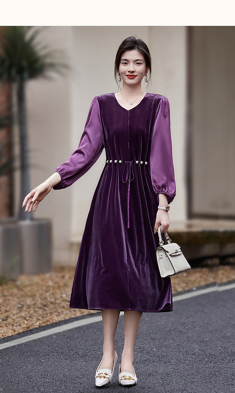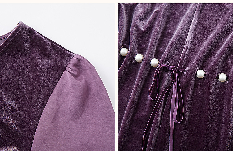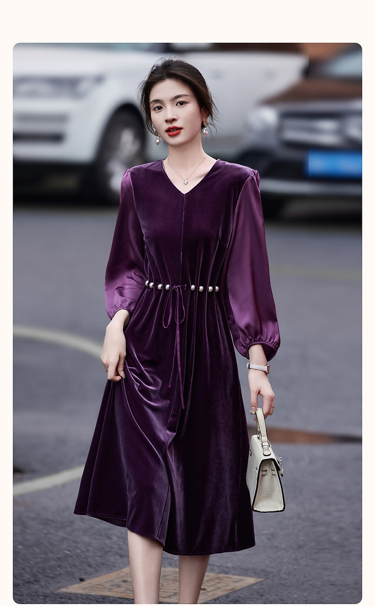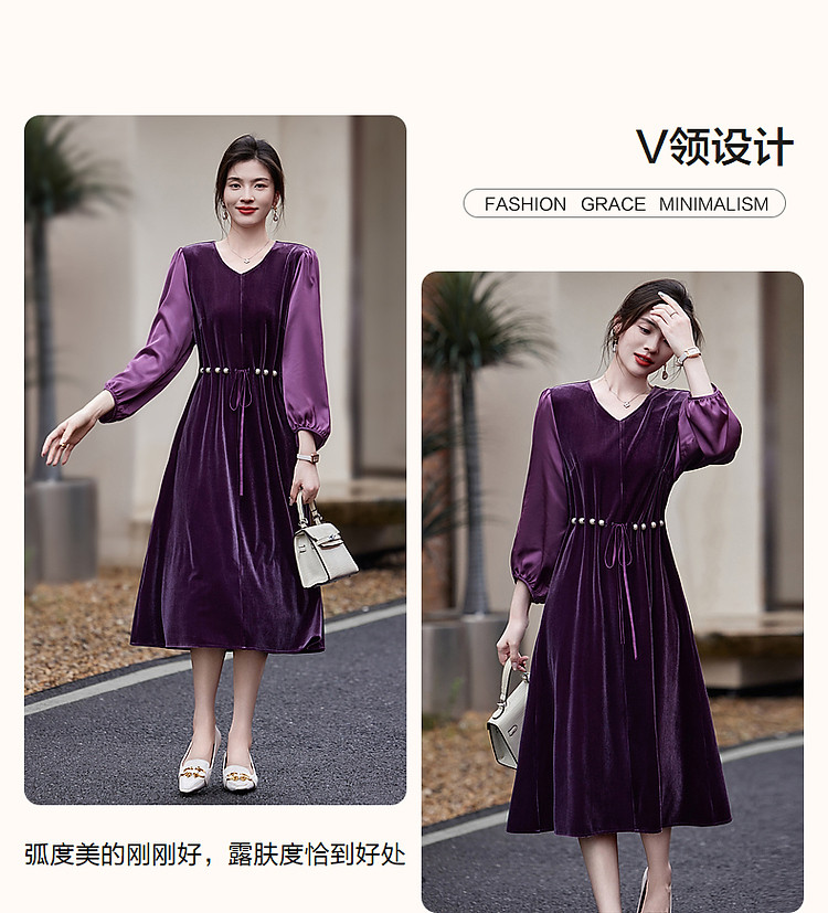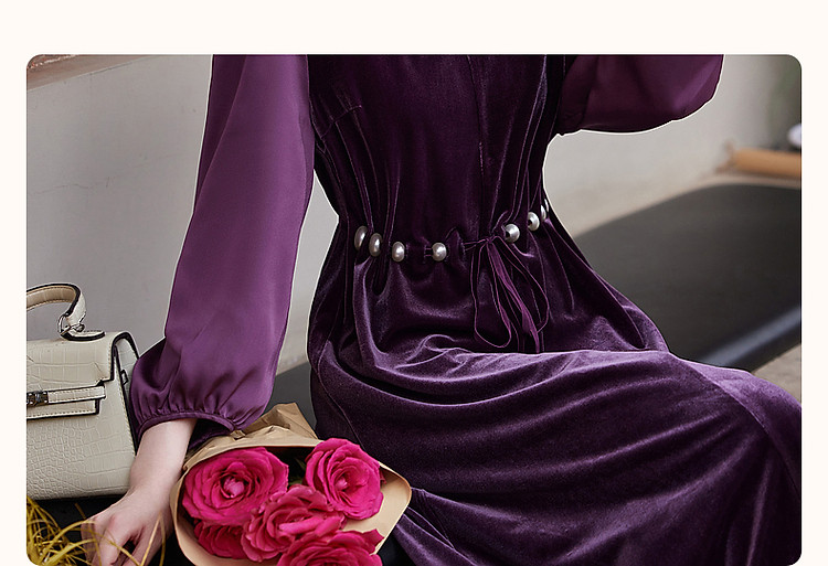 商品名称:【闪耀氛围感】春秋名媛风V领珍珠腰带茶歇裙泡泡袖女式连衣裙 143937