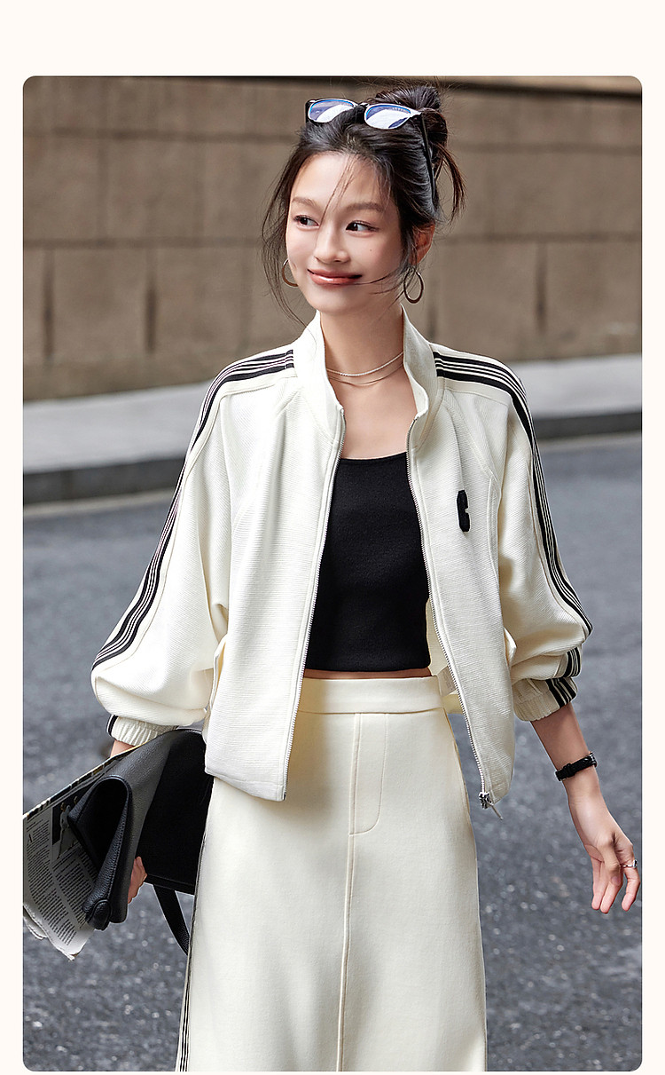 商品名称:【豆蔻年华】春秋运动风立领撞色织带字母藏肉舒适针织外套女短款 054209