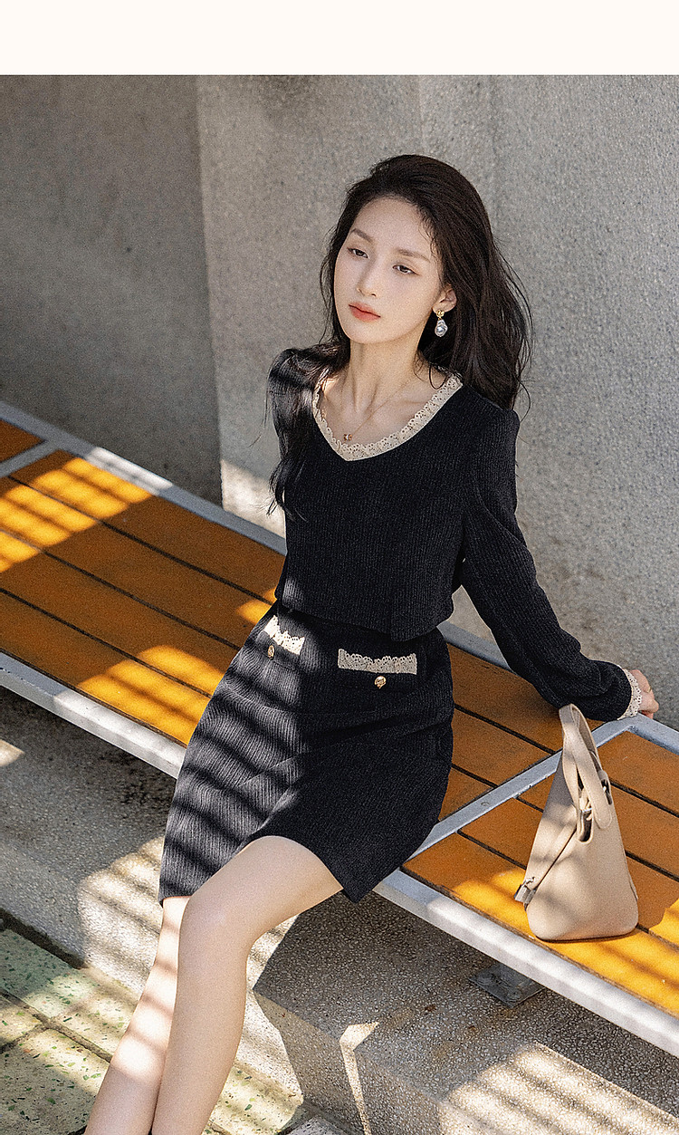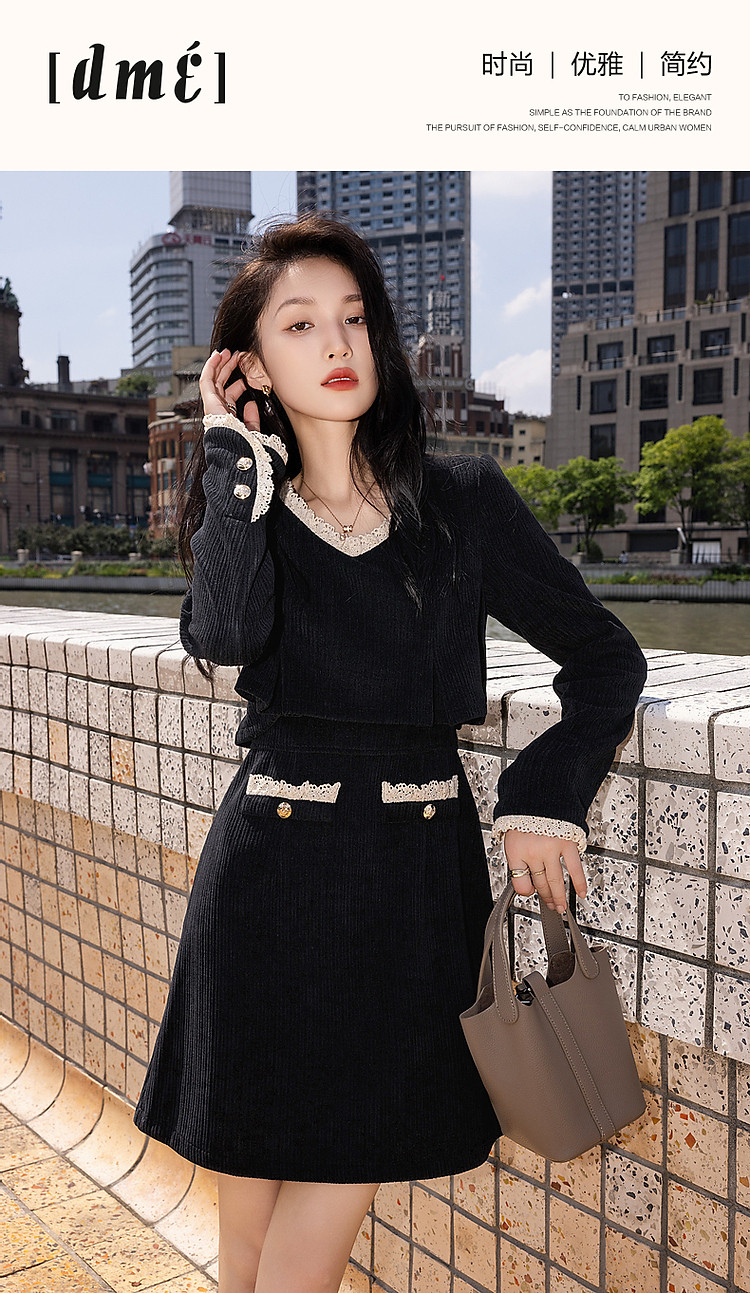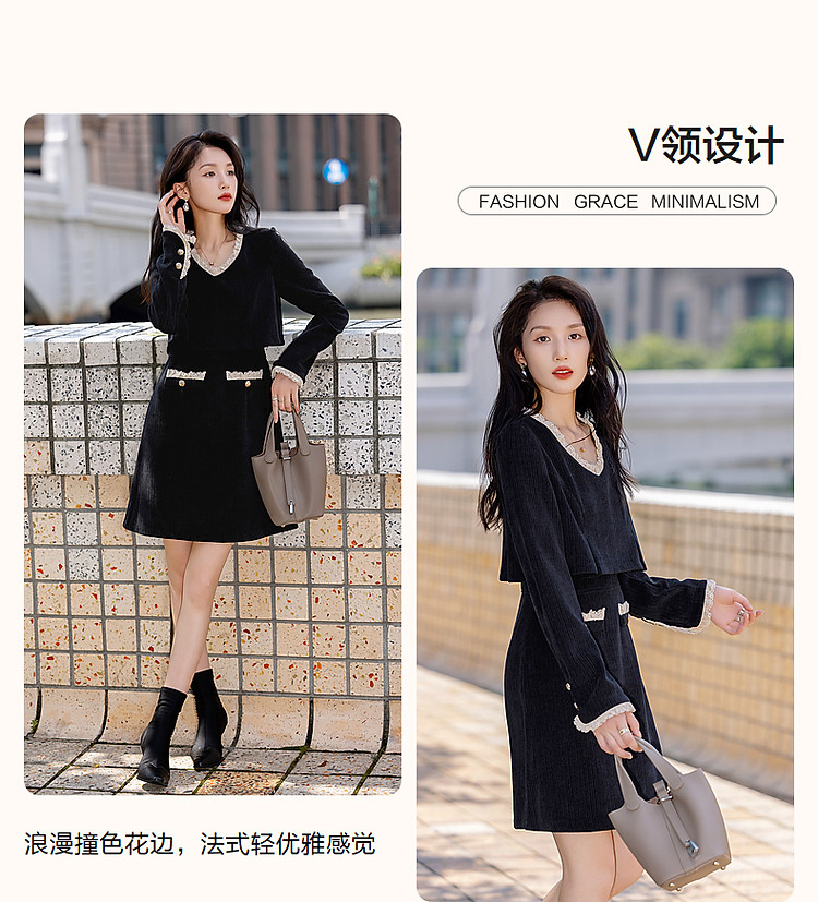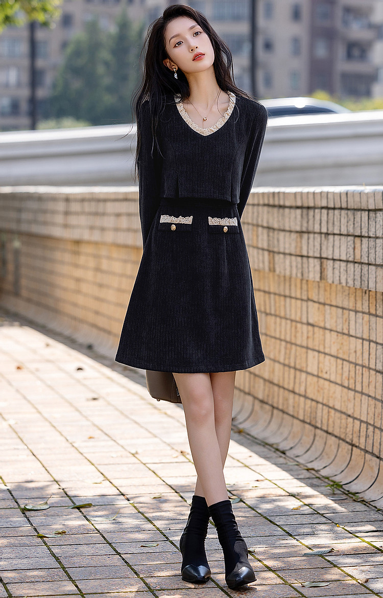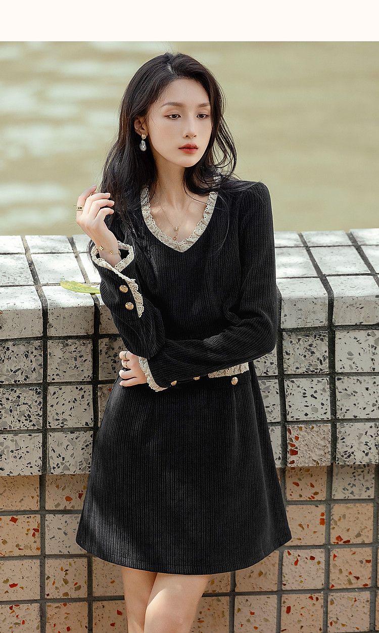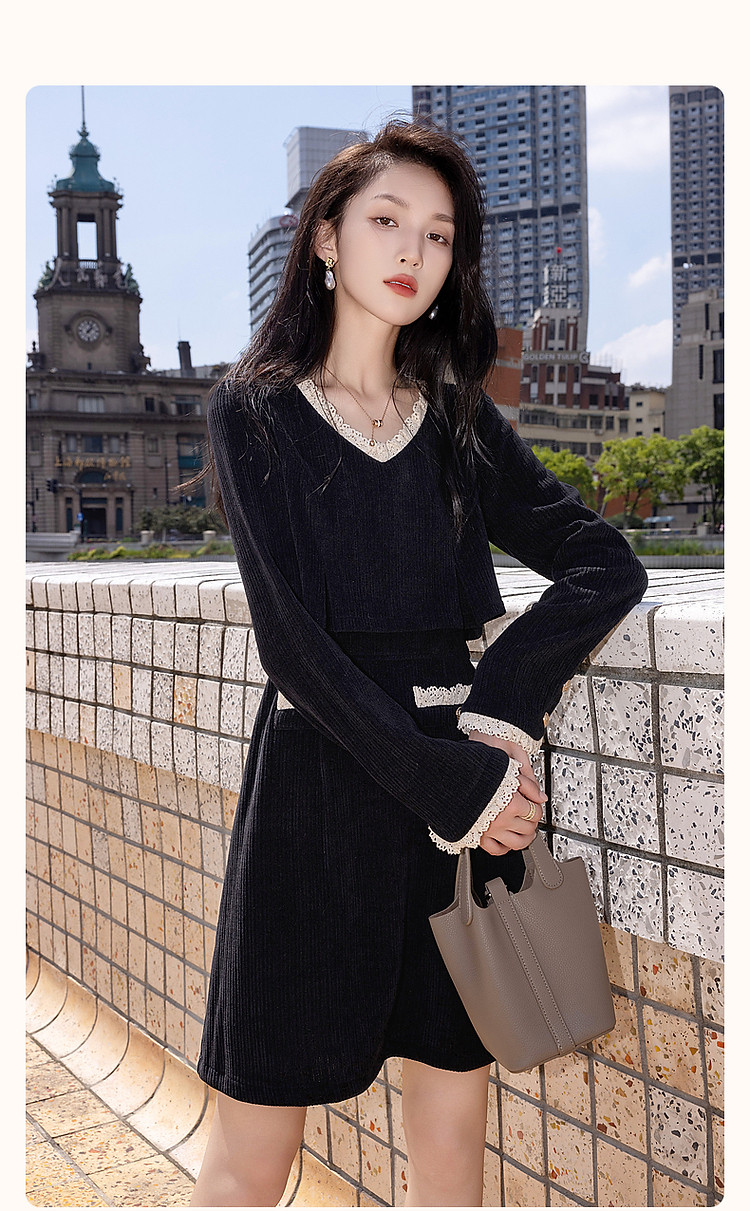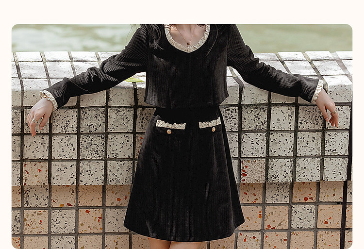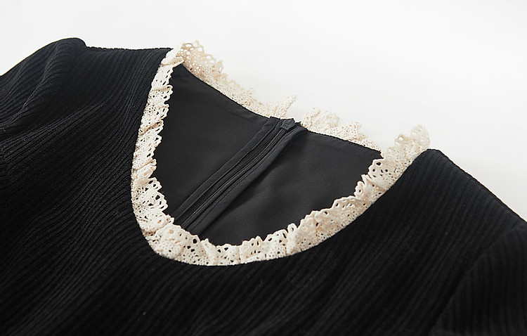商品名称:【闲织秋光】春秋名媛风灯芯绒撞色花边遮肉A字女式针织连衣裙 091585