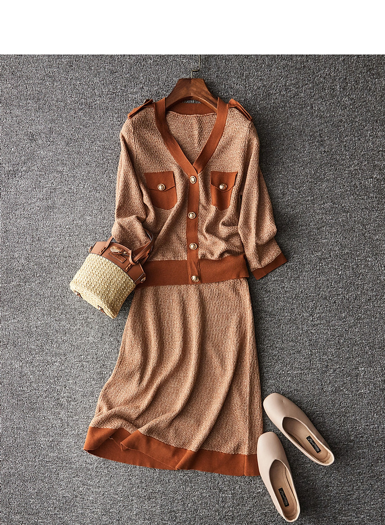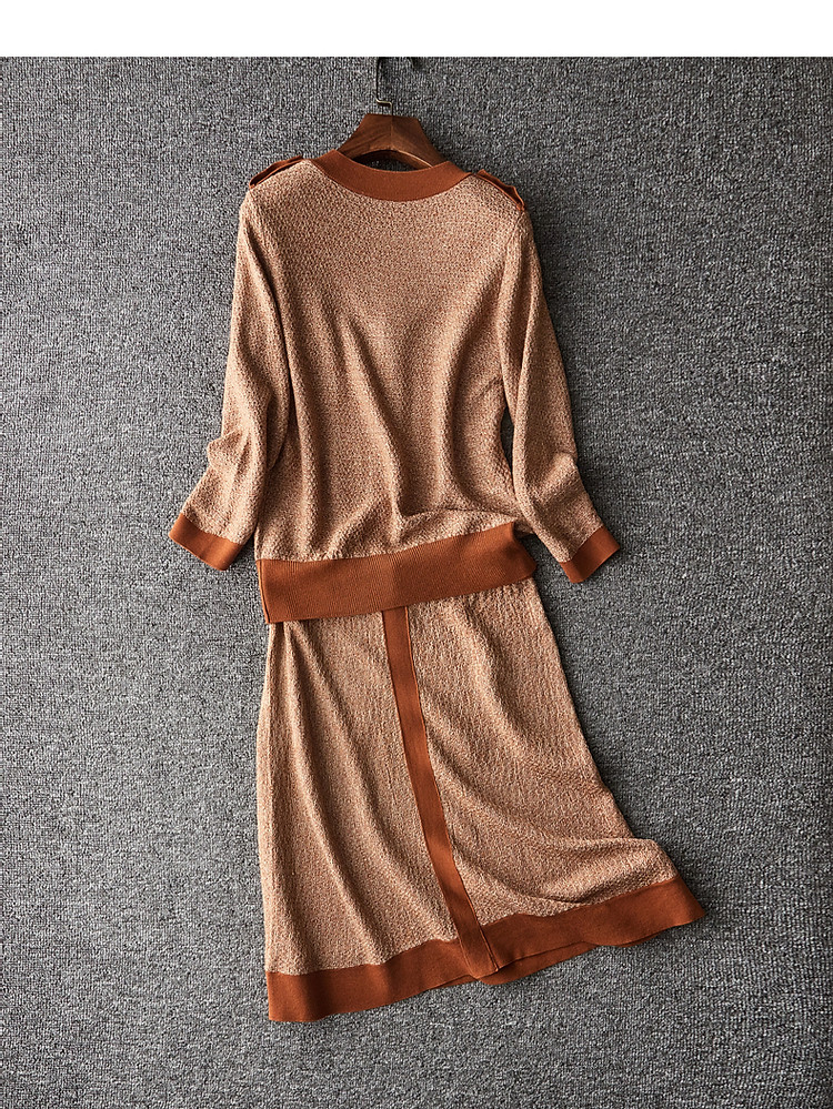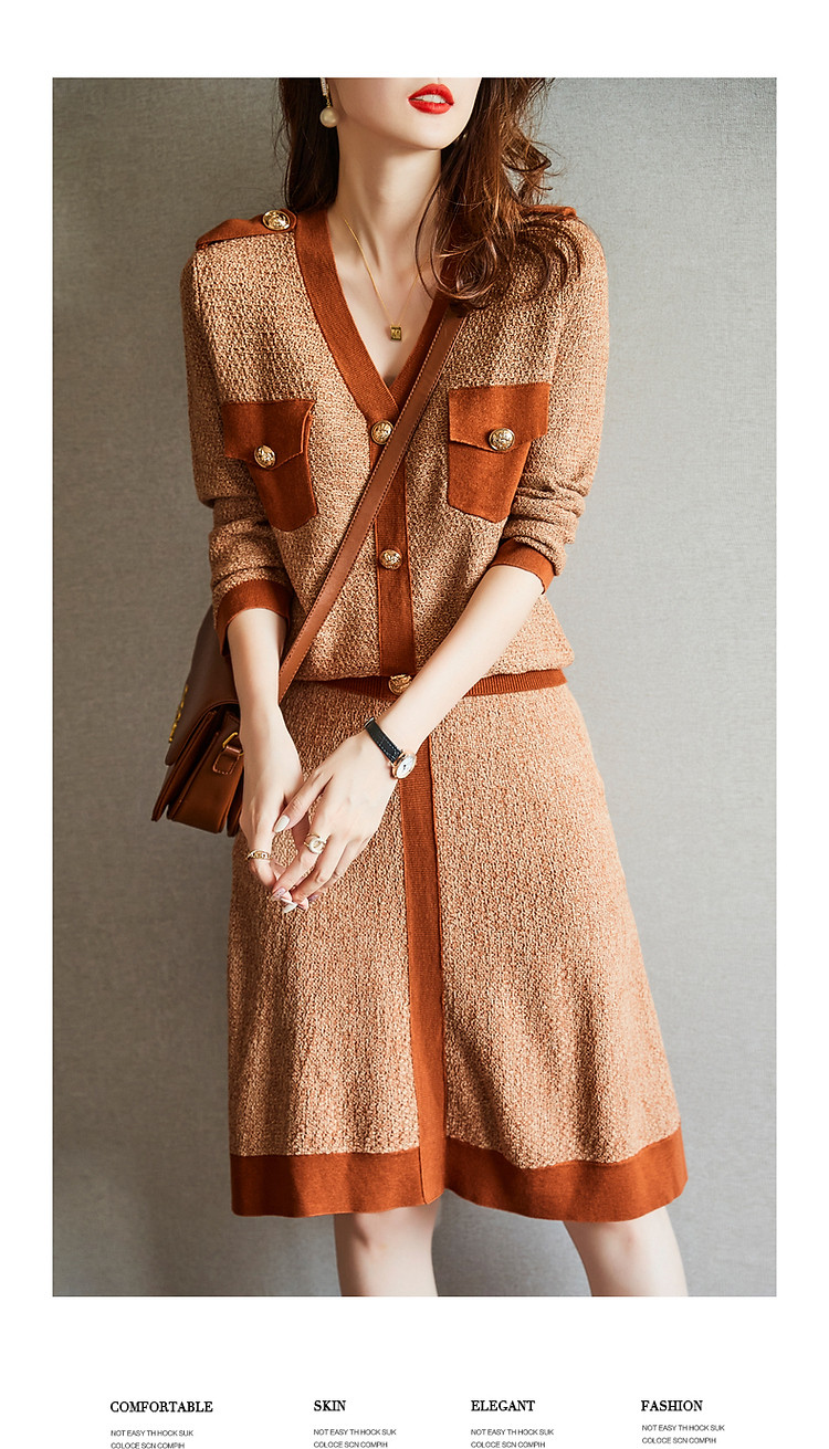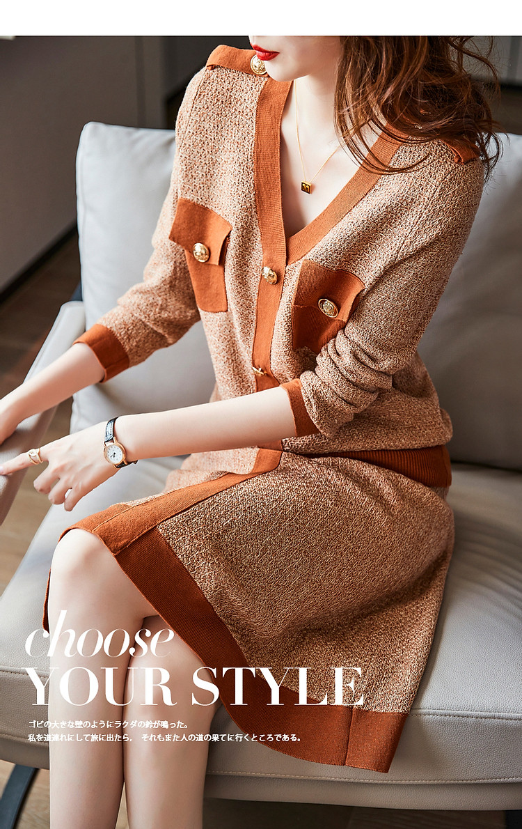 【针织套装】春秋新V领上衣浮雕金扣高腰小A包臀半裙套装女时尚 296257