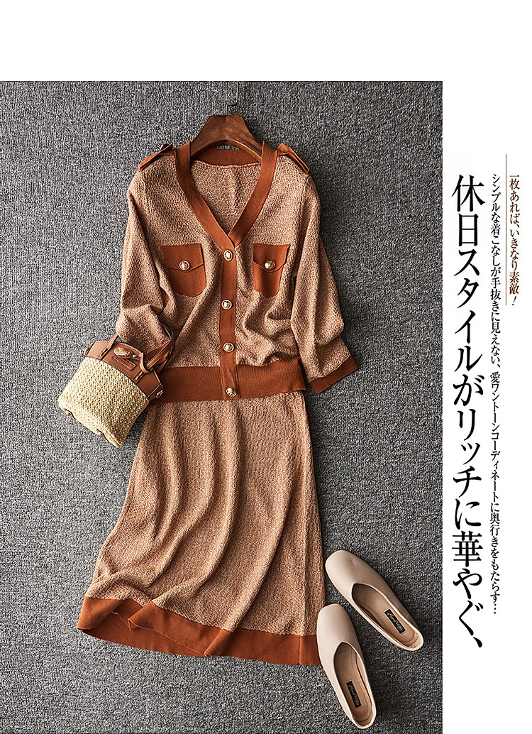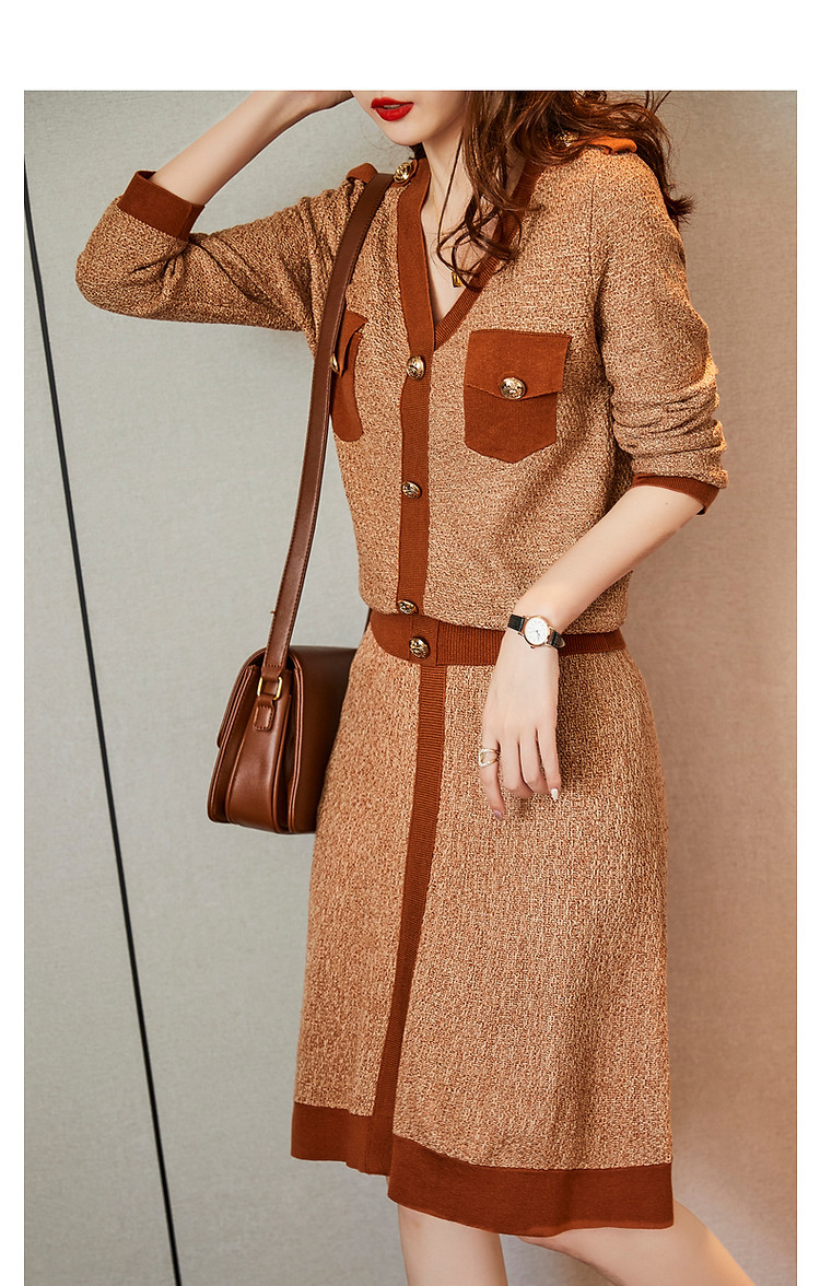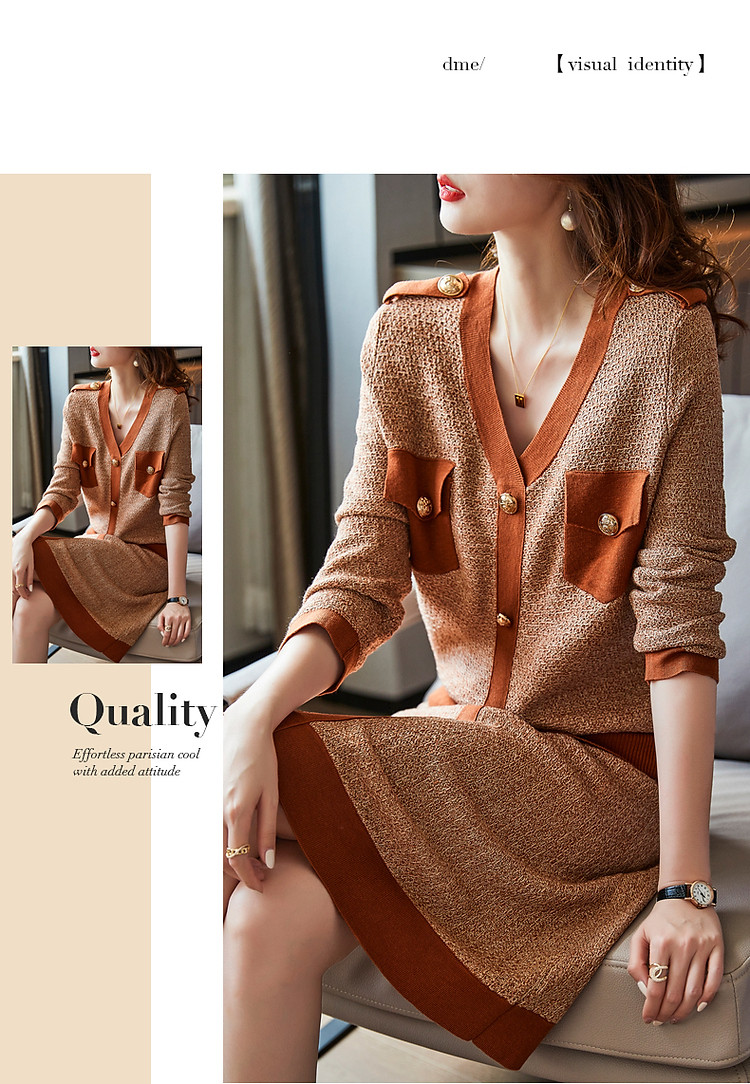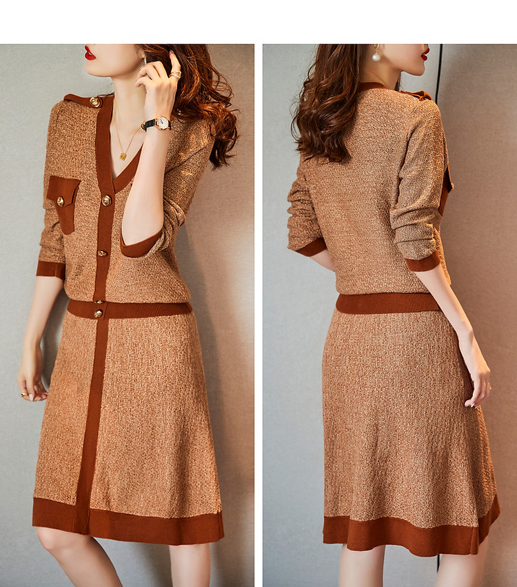 【针织套装】春秋新V领上衣浮雕金扣高腰小A包臀半裙套装女时尚 296257