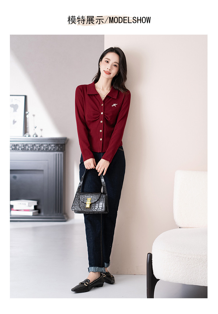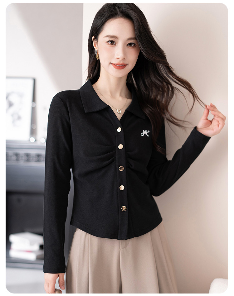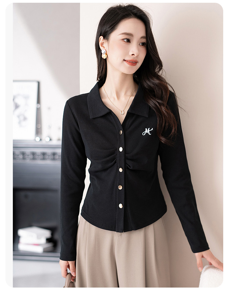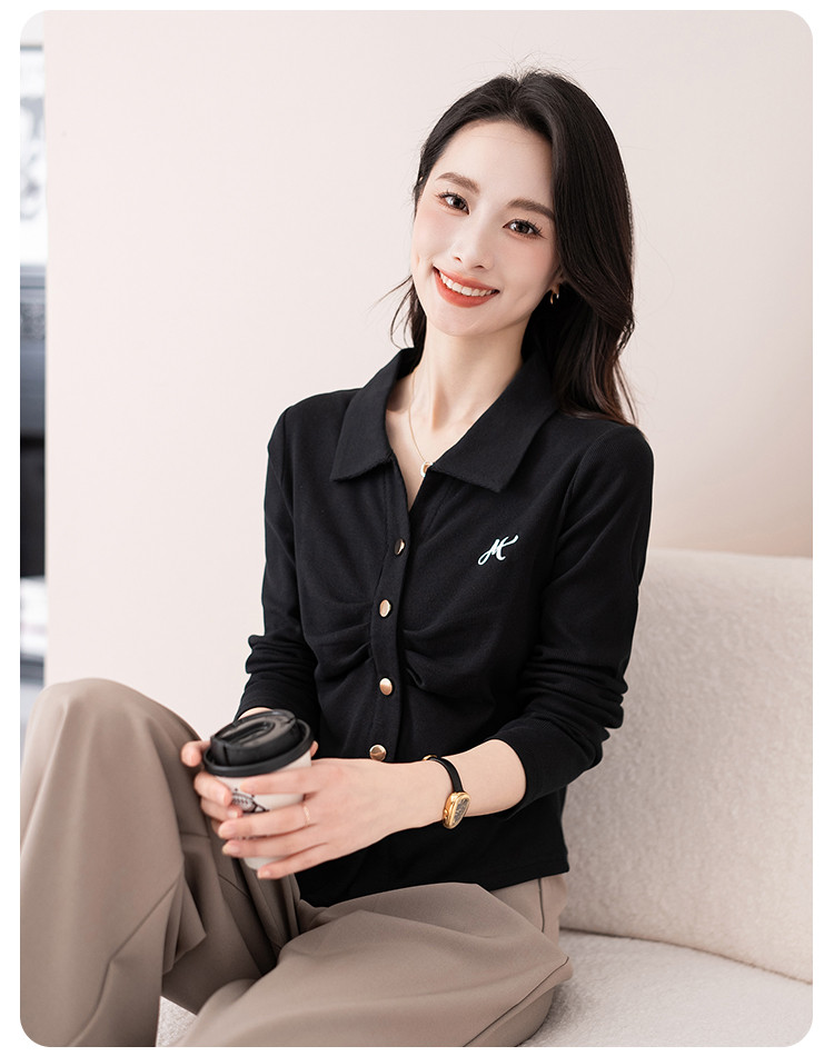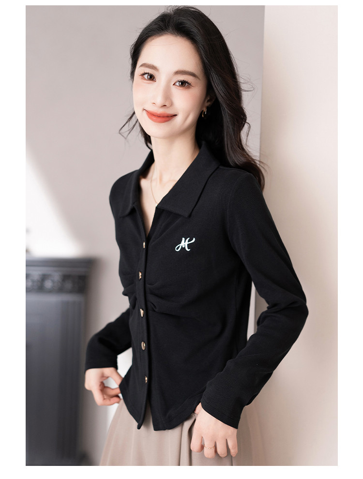 开衫单排扣翻领长袖T恤女修身舒适显瘦休闲精美刺绣冬季小外套潮 706433