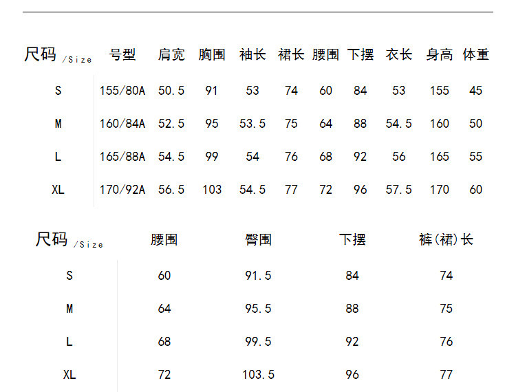 | 尺码 | 裙长(cm) | 肩宽(cm) | 袖长(cm) | 上装号型 | 下装号型 | 衣长(cm) | 腰围(cm) | 臀围(cm) | 胸围(cm) | 号型 |