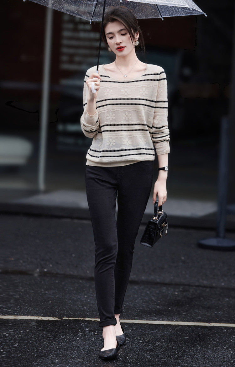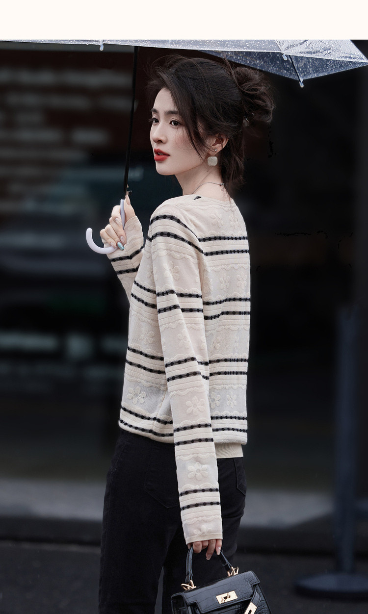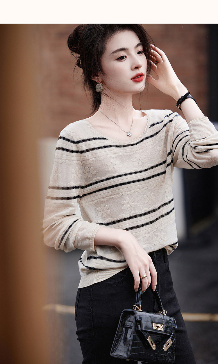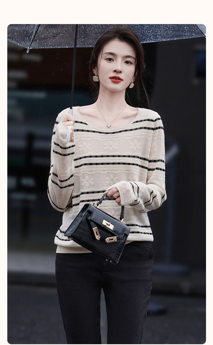 商品名称:【微胖系列】夏空气感莱赛尔线衫花边圆领条纹提花针织衫女上衣 154433
