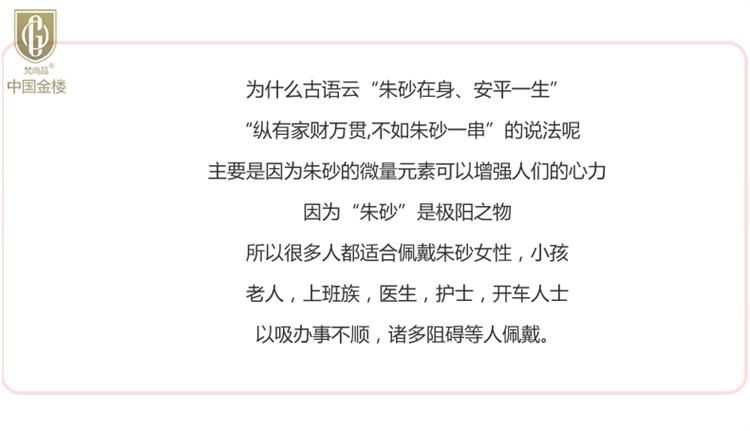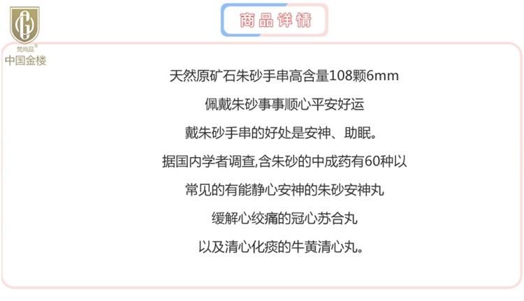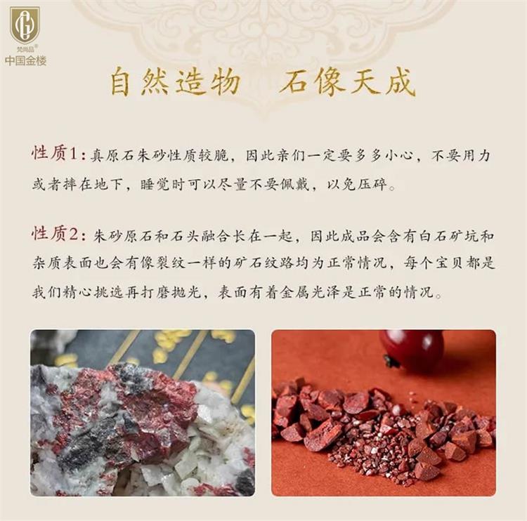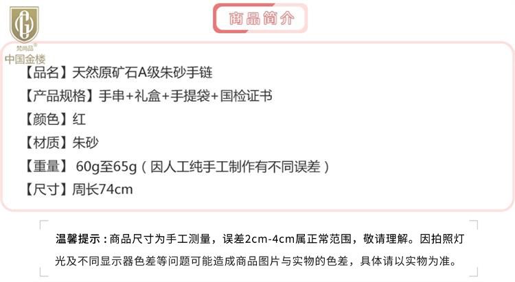 商品名称:中国金楼梵尚品天然原矿石A级朱砂手链HKZLF01006送礼好物(买一赠一送汉白玉手串)