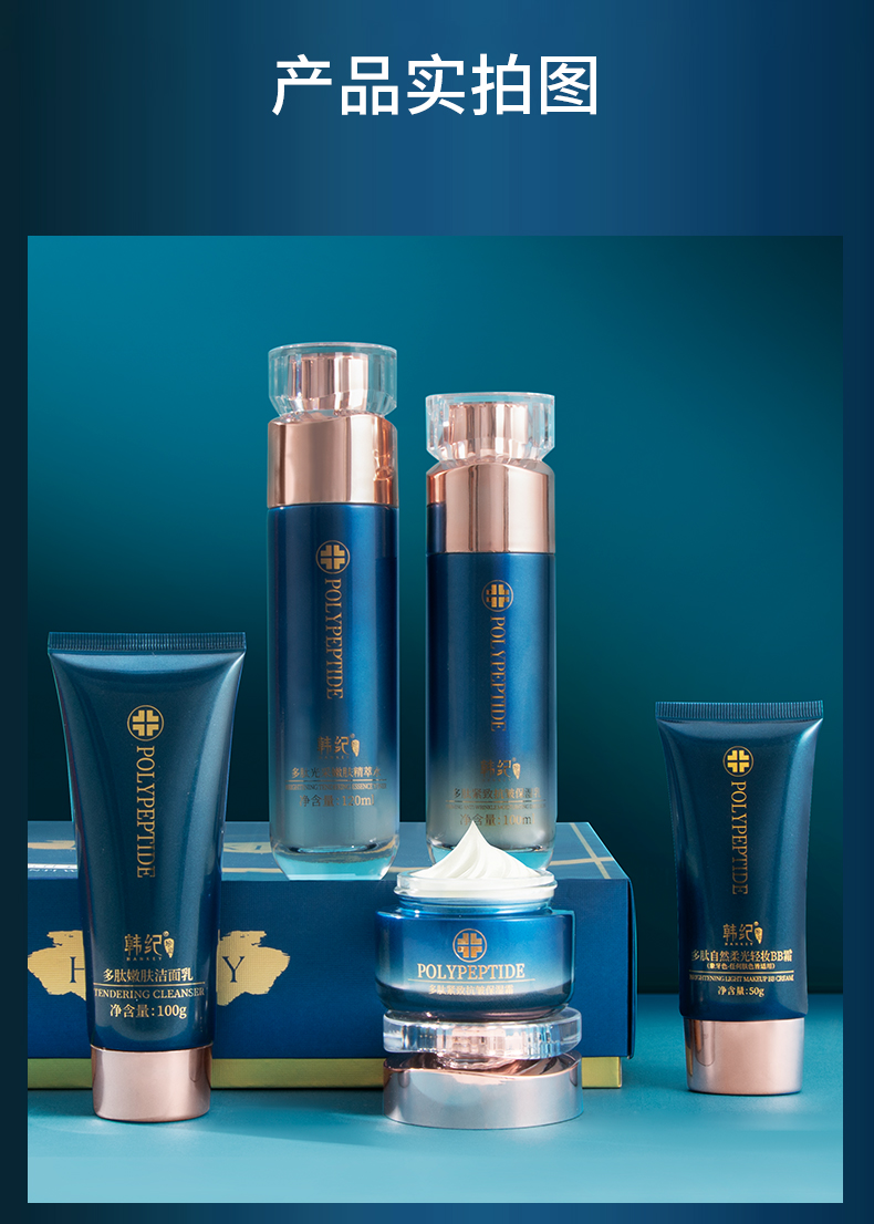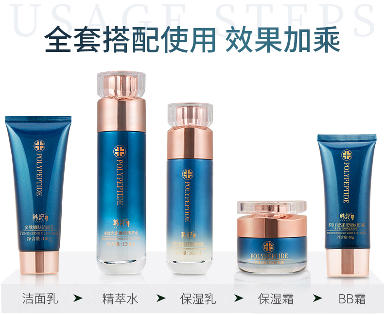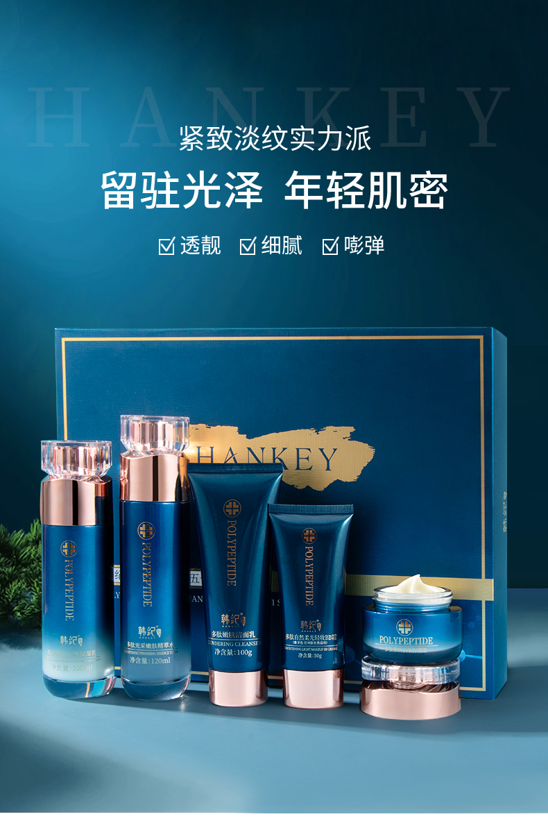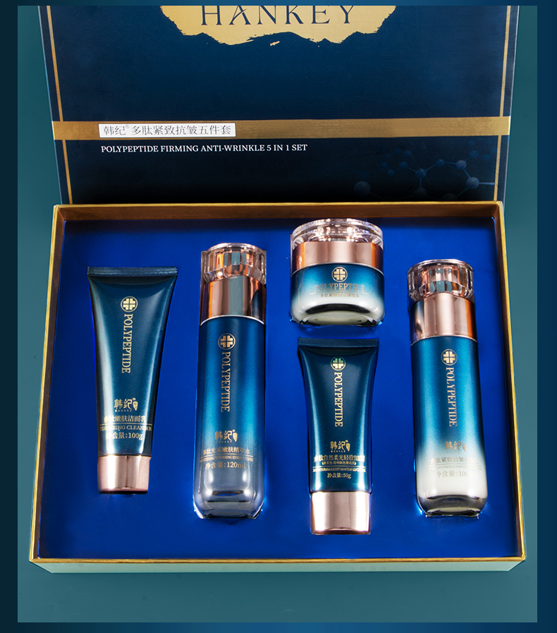 商品名称:Hankey/韩纪 多肽提拉紧致五件套 洁面乳100g+蜜露120ml+精华乳100ml+紧致霜50g+BB霜50g
