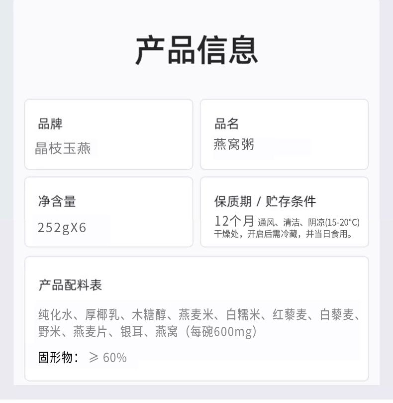 商品名称:晶枝玉燕厚椰乳燕窝粥 (礼盒装)252克*6碗/盒