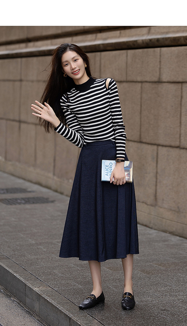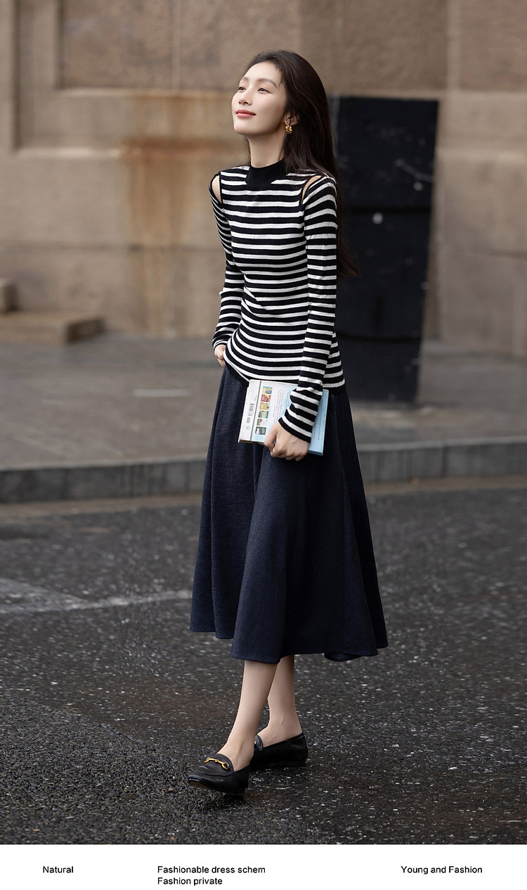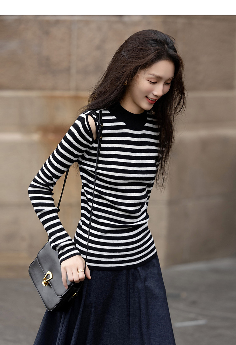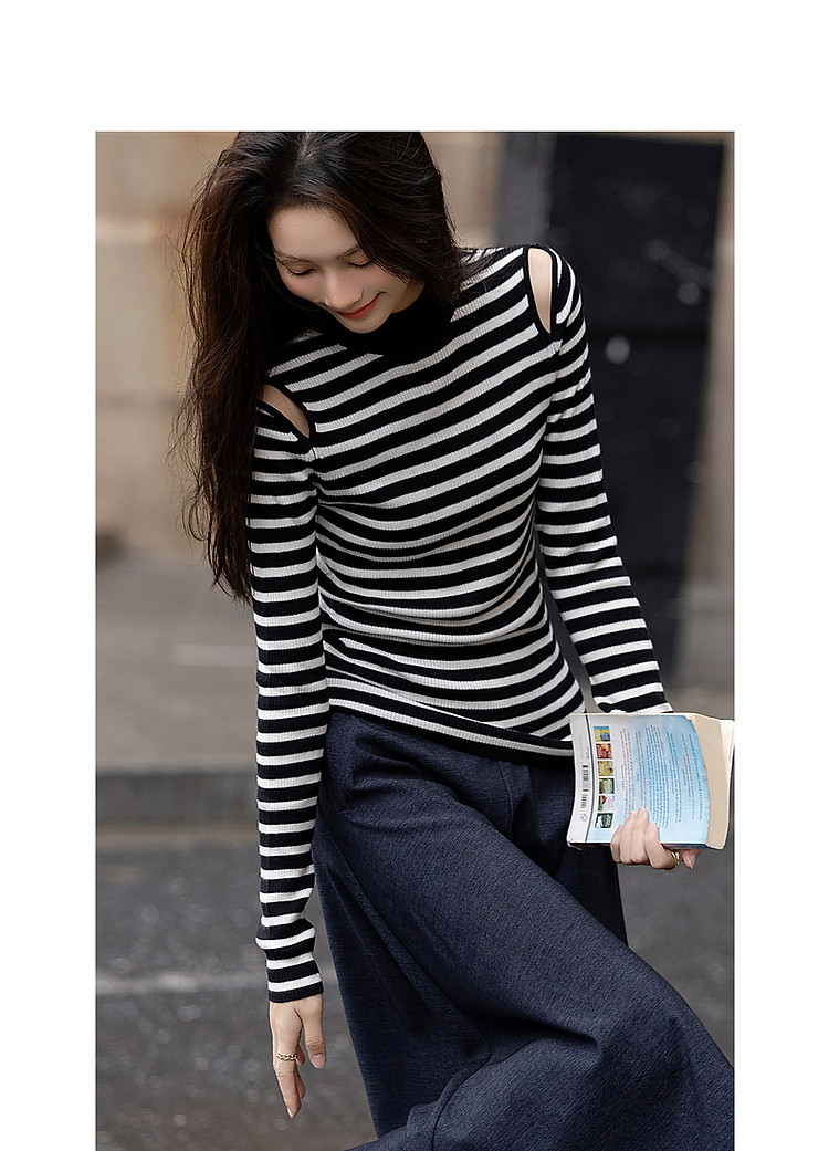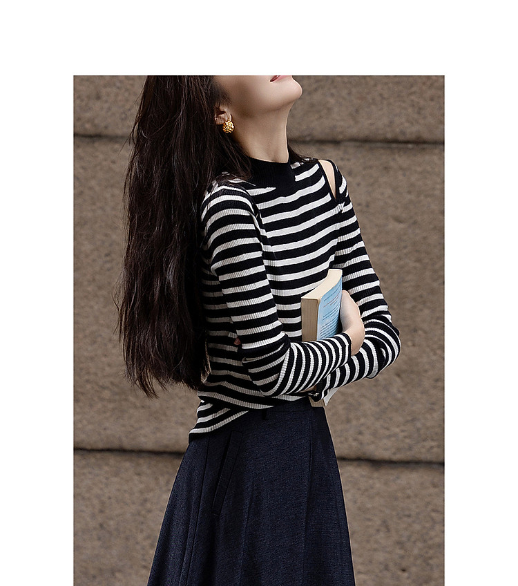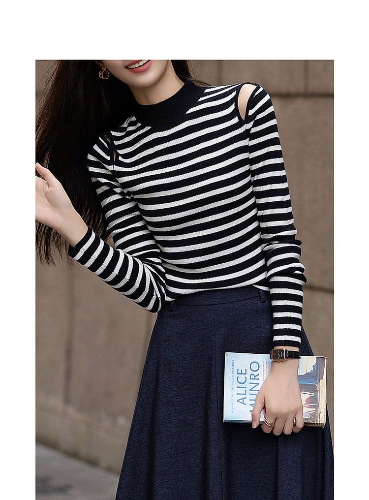 【条纹游乐园】秋复古撞色半高领露肩线衫小开叉针织衫女上衣 185153