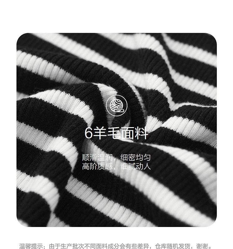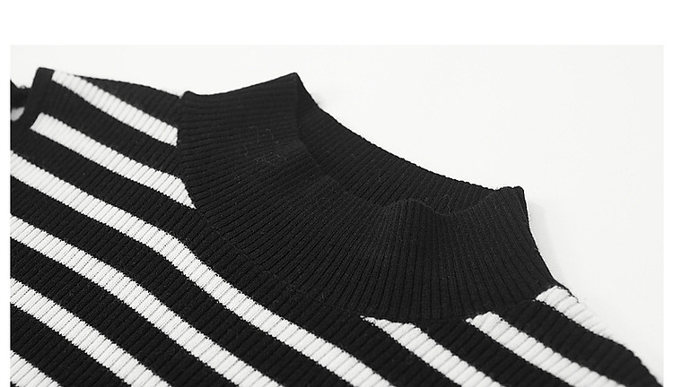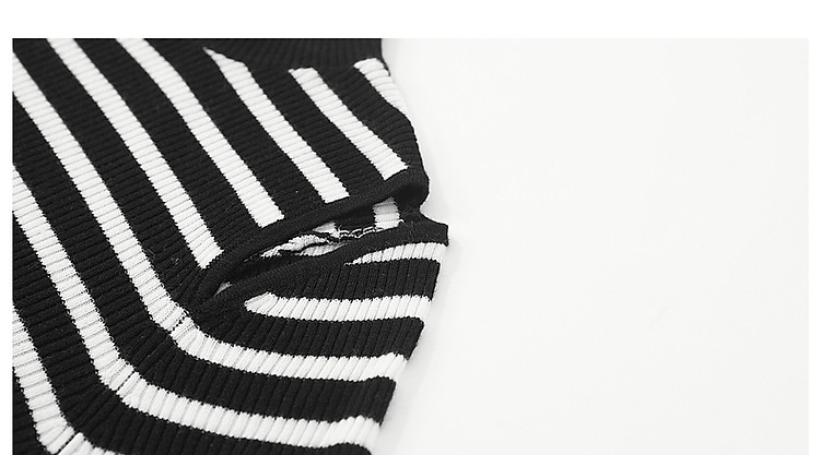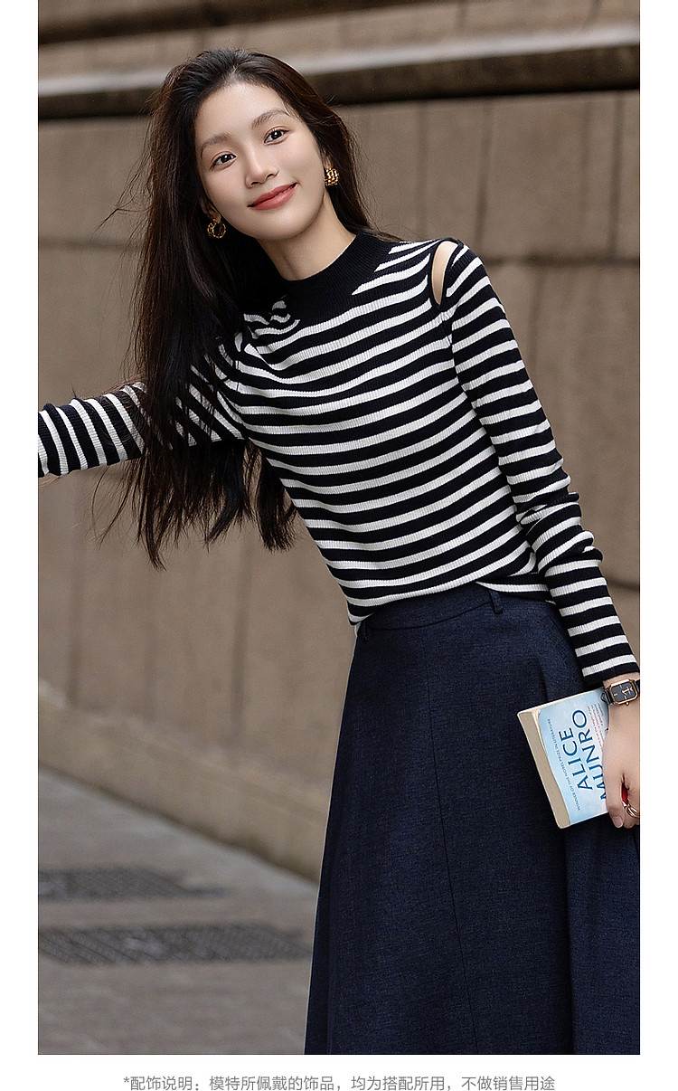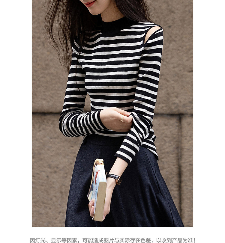 商品名称:【条纹游乐园】秋复古撞色半高领露肩线衫小开叉针织衫女上衣 185153