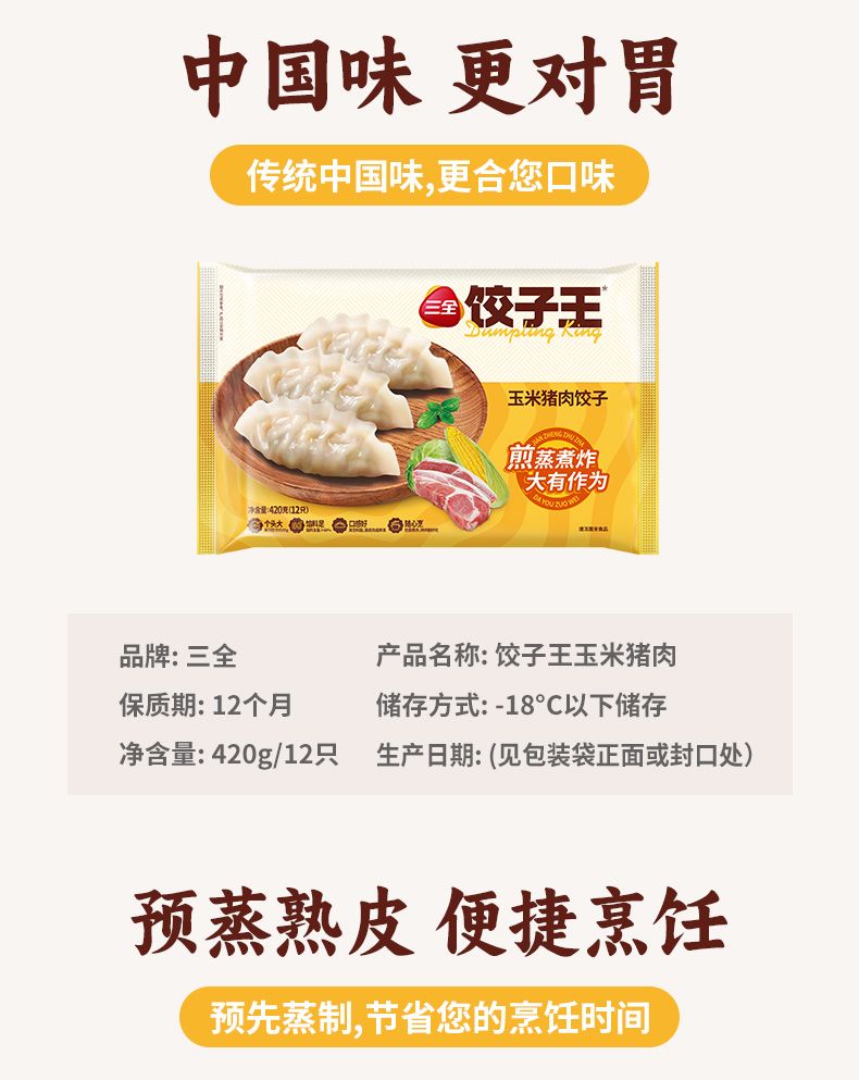 商品名称:三全猪肉玉米风味饺子王420g(煎饺)*3