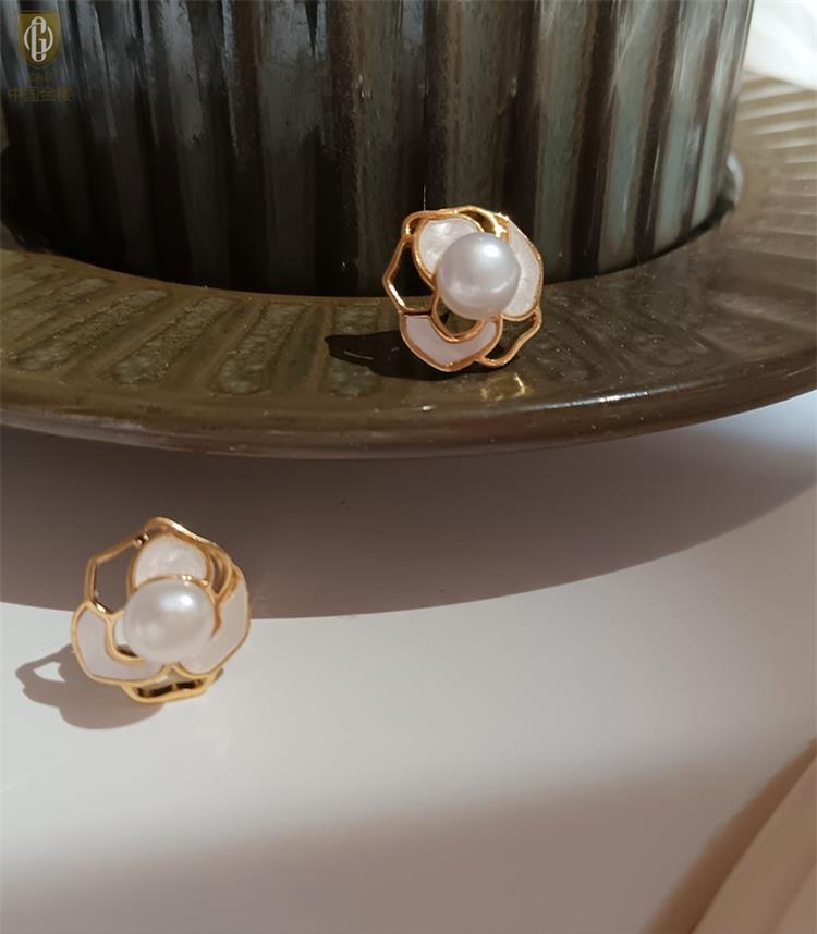 中国金楼梵尚品天然珍珠镶白母贝镂空山茶花耳钉(对)ZZX42380852送礼送女友送长辈生日礼物