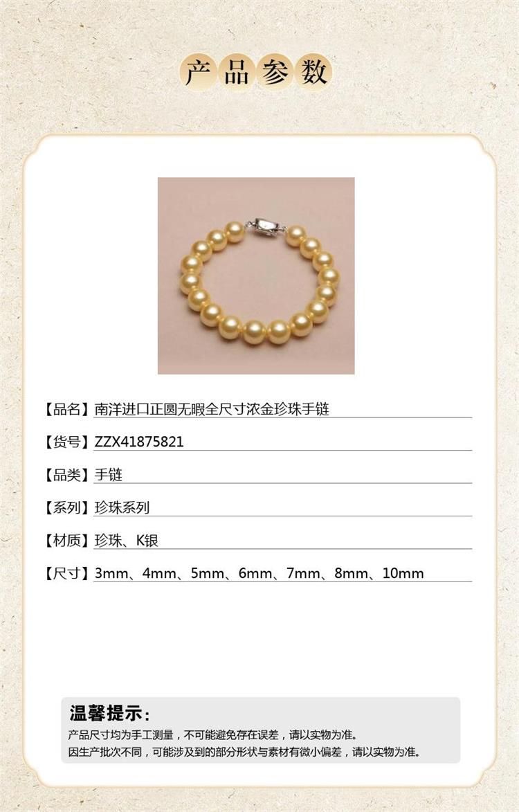 商品名称:中国金楼梵尚品南洋进口正圆无暇全尺寸浓金珍珠手链ZZX41875821送礼送女友送长辈生日礼物