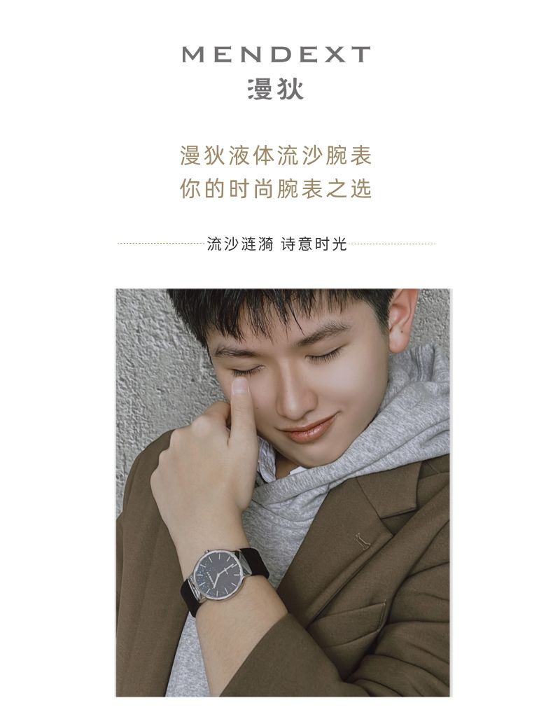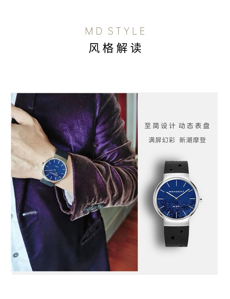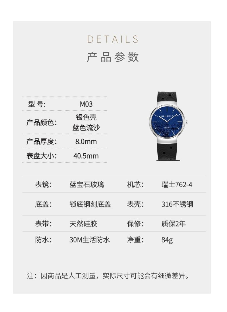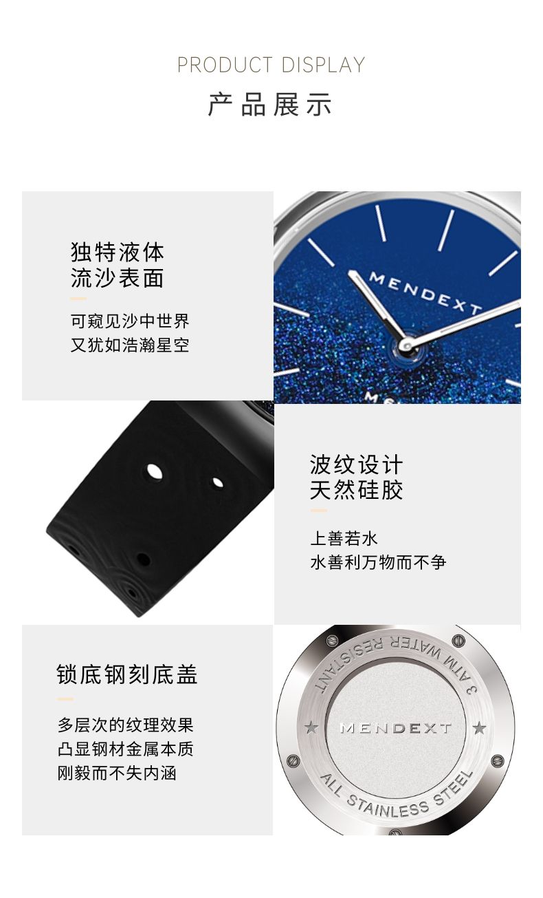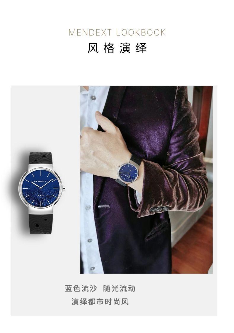 商品名称:MENDEXT漫狄蓝色流沙面 钢色表壳 黑色表带M6IX-M03男士学生腕表白领手表
