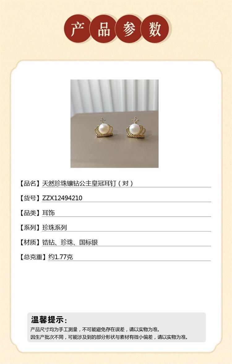 商品名称:中国金楼梵尚品天然珍珠镶钻公主皇冠耳钉(对)ZZX12494210送礼送女友送长辈生日礼物