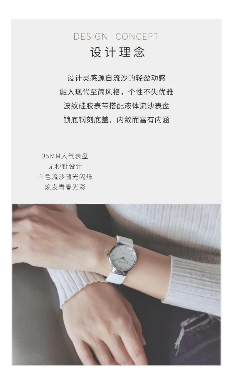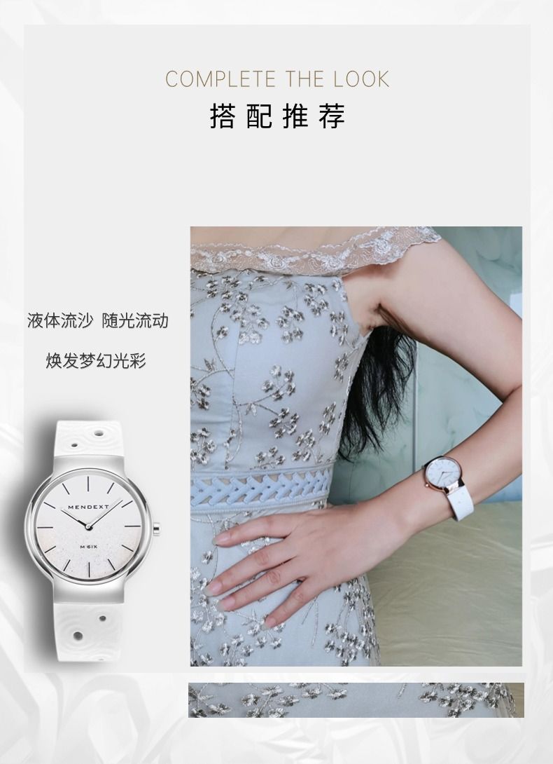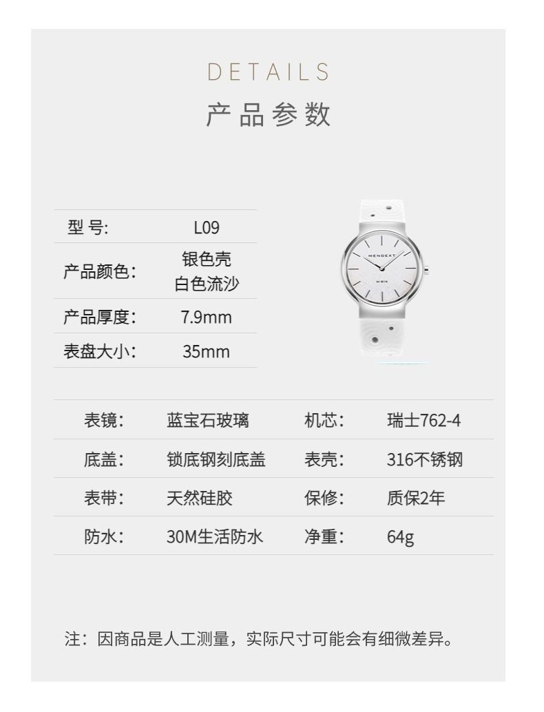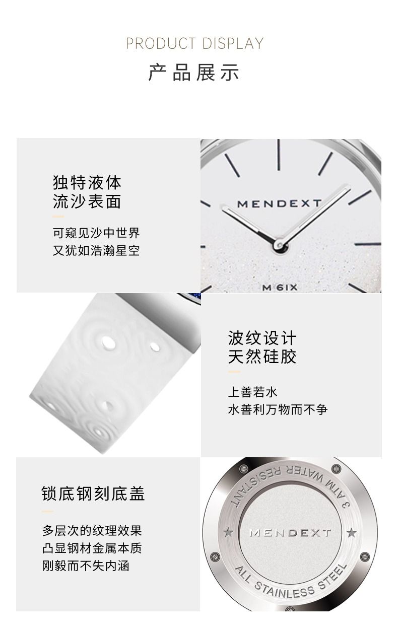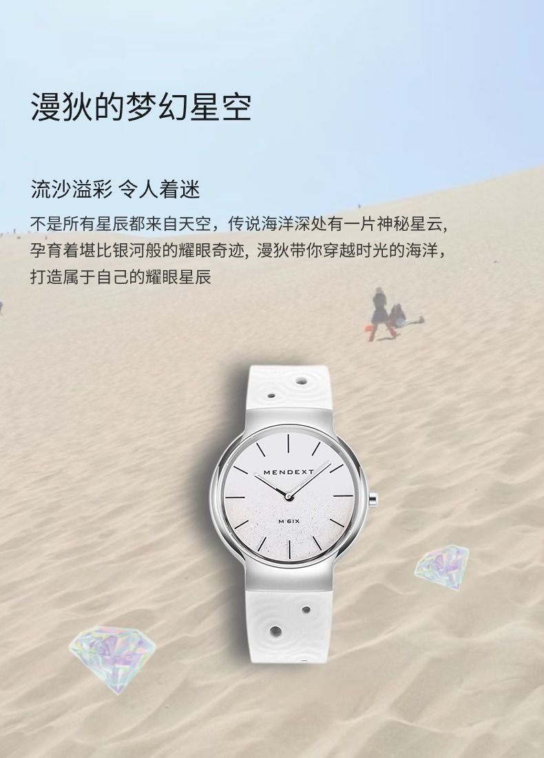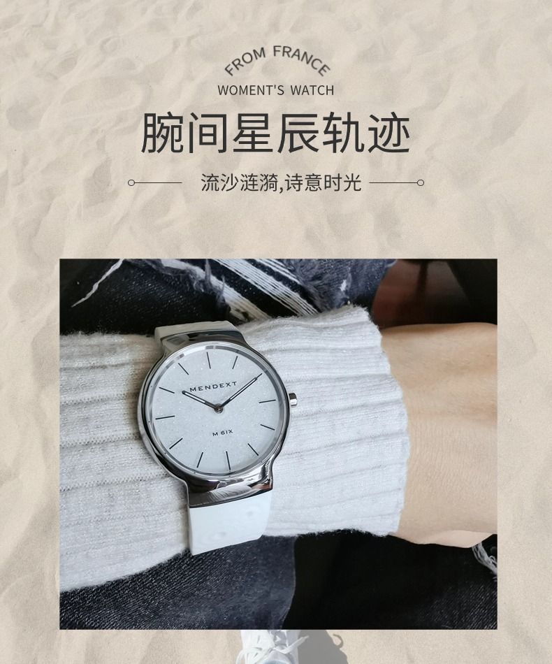 商品名称:MENDEXT漫狄白色流沙面 钢色表壳 白色表带M6IX-L09女士学生腕表手表