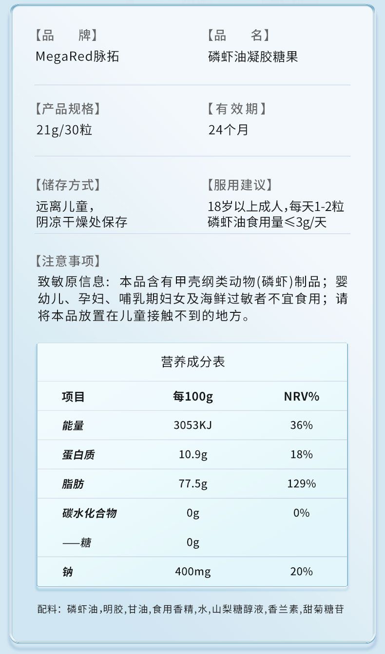 商品名称:MegaRed脉拓 纯南极磷虾油凝胶糖果 30粒