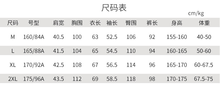 尺码 肩宽(cm) 袖长(cm) 衣长(cm) 身高(cm) 裤长(cm) 体重(kg) 臀围(cm) 胸围(cm) 号型