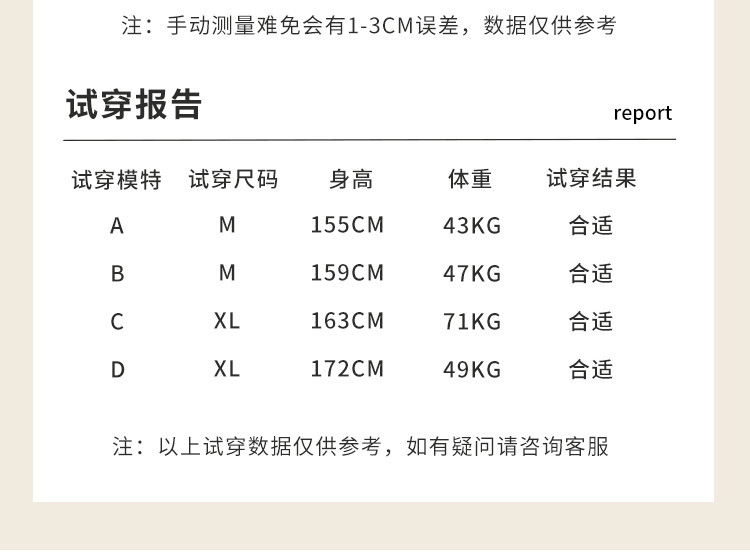 | 尺码 | 肩宽(cm) | 袖长(cm) | 衣长(cm) | 身高(cm) | 腰围(cm) | 裤长(cm) | 体重(kg) | 臀围(cm) | 胸围(cm) | 号型 |
