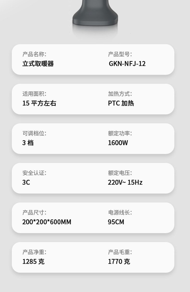 商品名称:格卡诺新款立式取暖器家用卧室暖风机浴室速热节能电暖机(连体)GKN-NFJ-12
