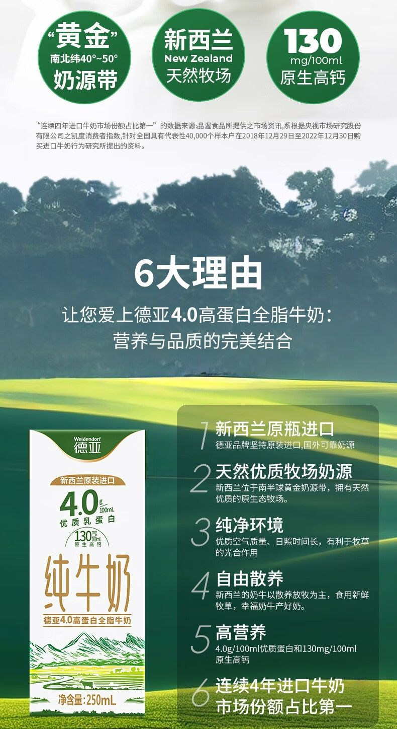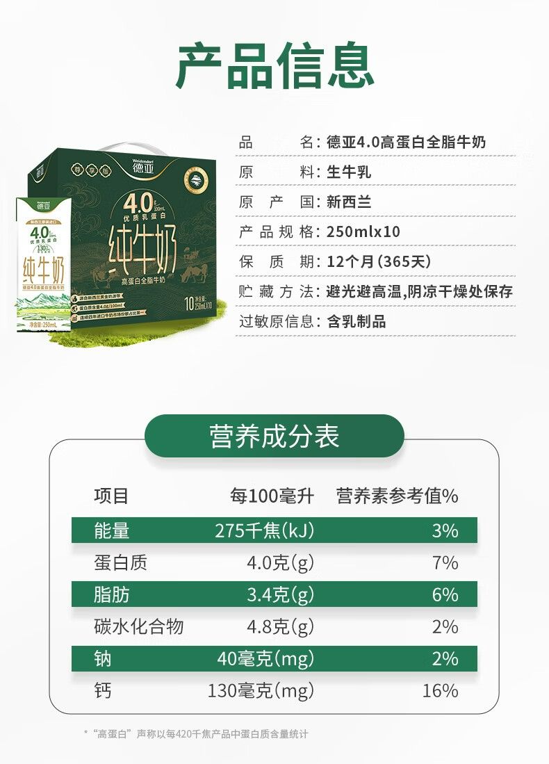 商品名称:德亚 4.0g全脂牛奶250ml*10(尊享版)礼盒装 营养早餐奶送礼 进口纯牛奶