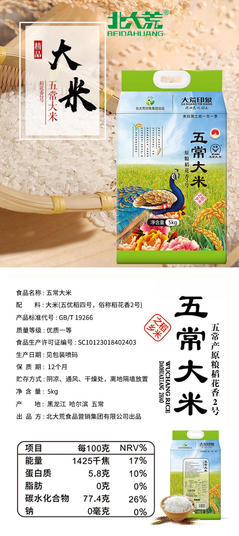 商品名称:北大荒 大荒印象 五常大米5kg 东北大米 稻花香 新日期
