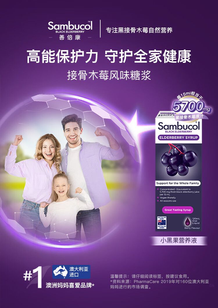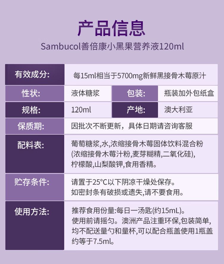 商品名称:Nature’s Way澳萃维佳思敏善倍康Sambucol黑接骨木莓糖浆复合维生素c口服液营养品120ml/瓶