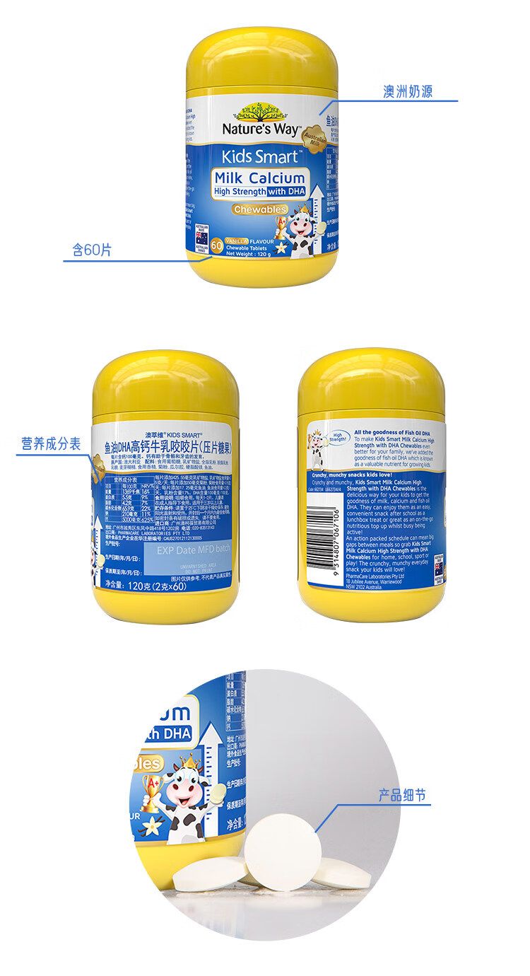 商品名称:Nature’s Way澳萃维佳思敏钙片儿童dha婴幼儿补钙益生元进口牛乳高钙dha鱼油3岁以上佳思敏钙片香草味60片