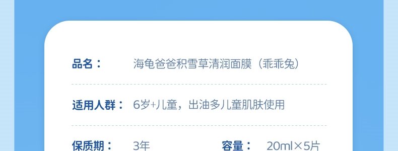 商品名称:海龟爸爸(Hipapa)积雪草清润面膜 乖乖兔 20ml*5片 6岁+