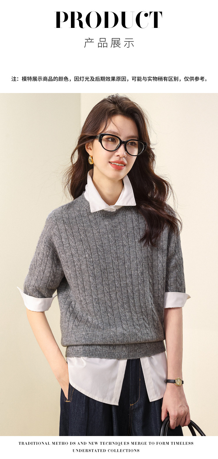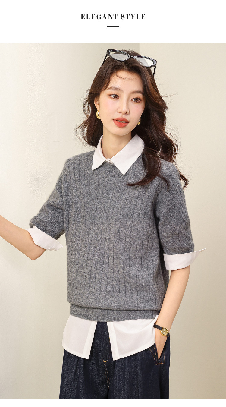 商品名称:【100%绵羊毛】简约百搭纯色圆领绞花短袖T恤羊毛针织打底衫 391443