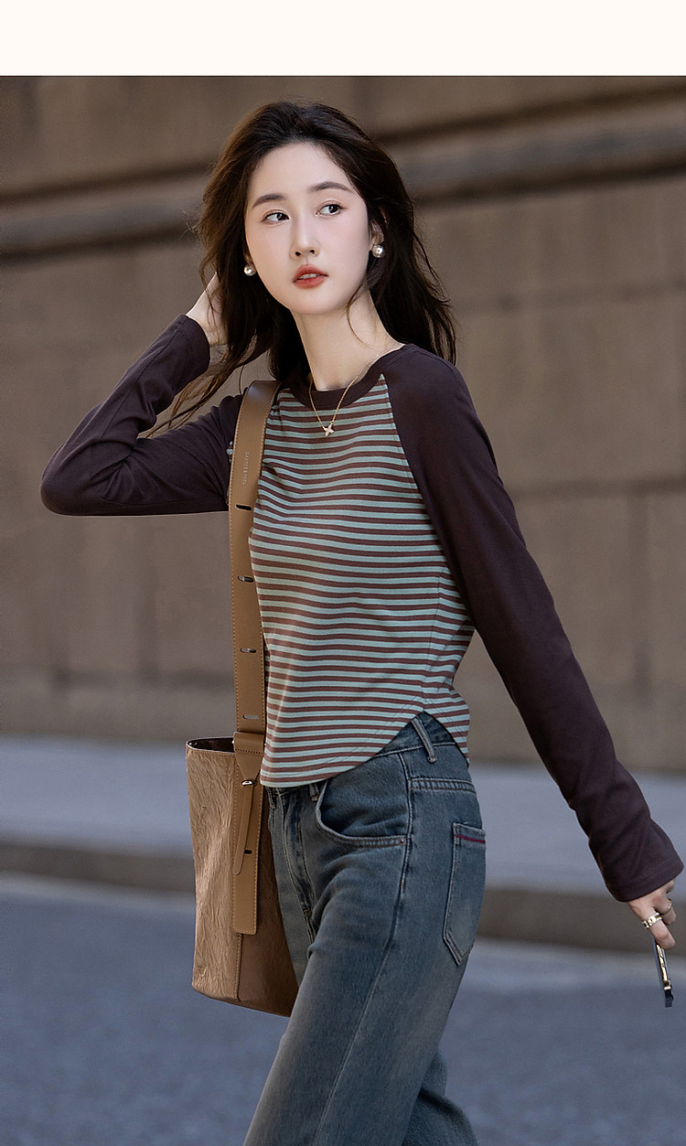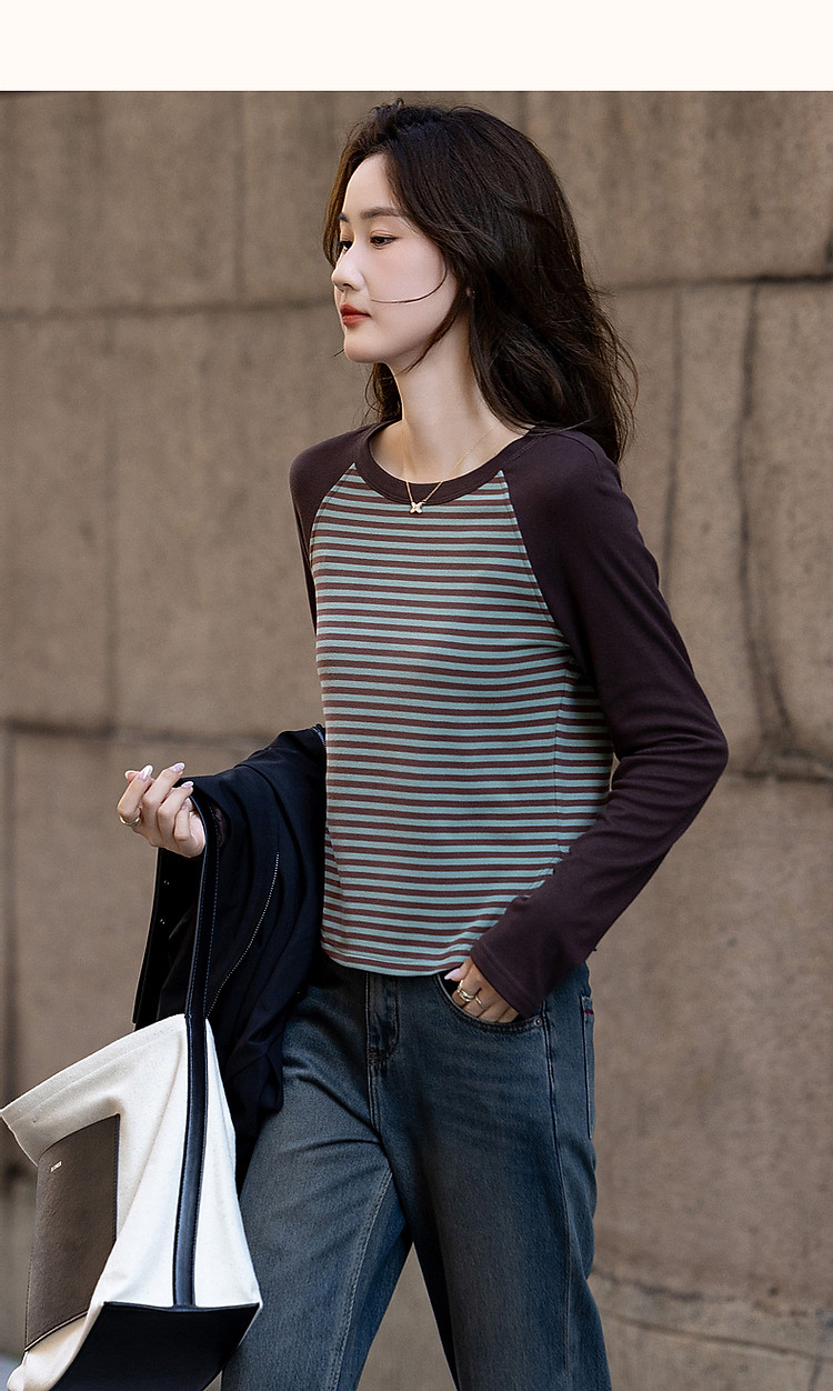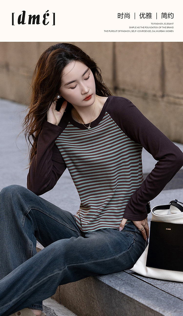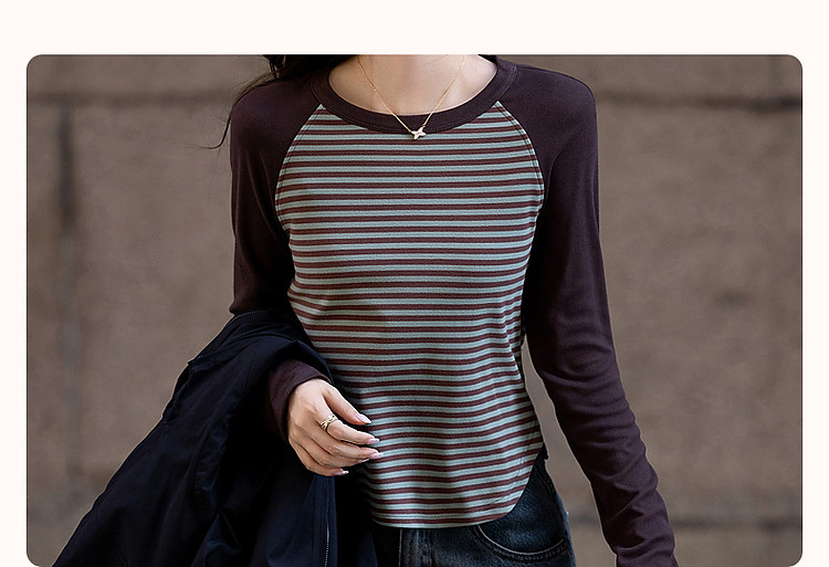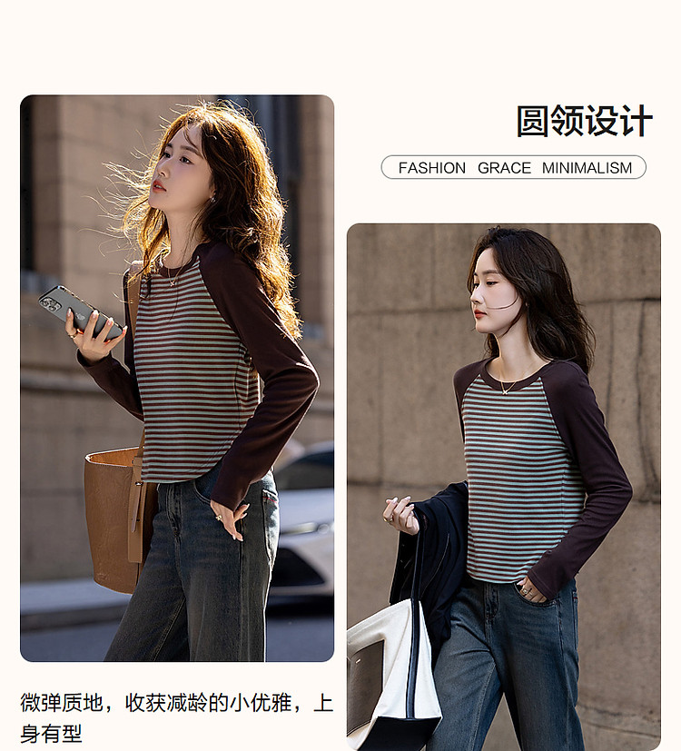 商品名称:【线条美学】春秋美式复古条纹拼色时髦遮肉高频好搭长袖女式t恤 989633