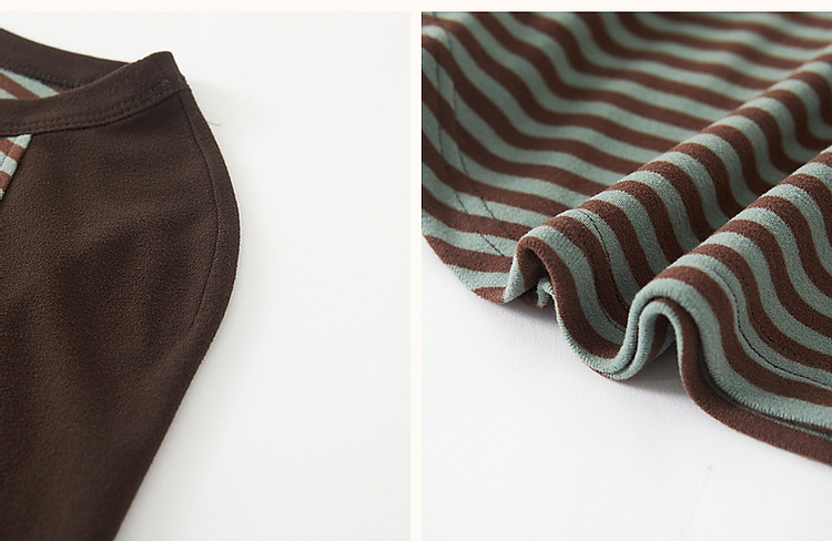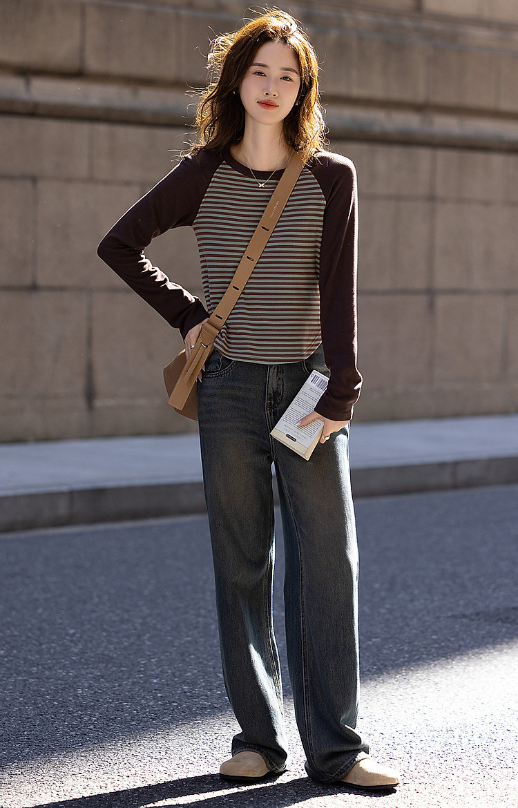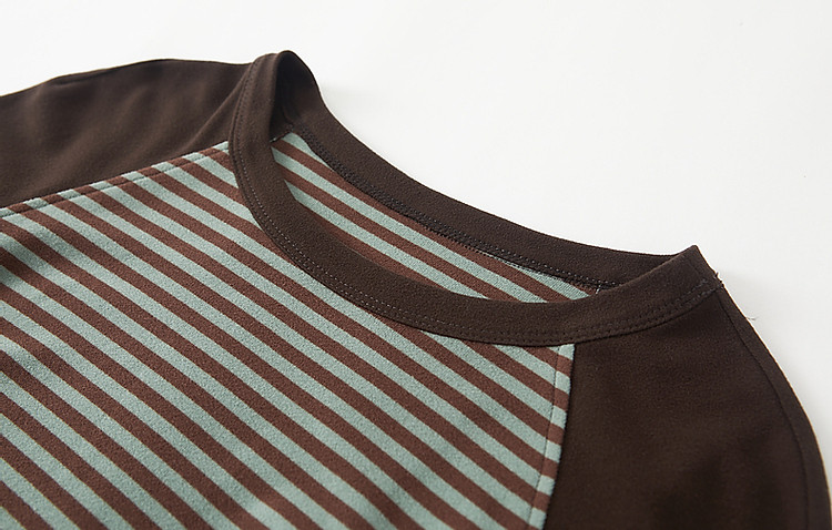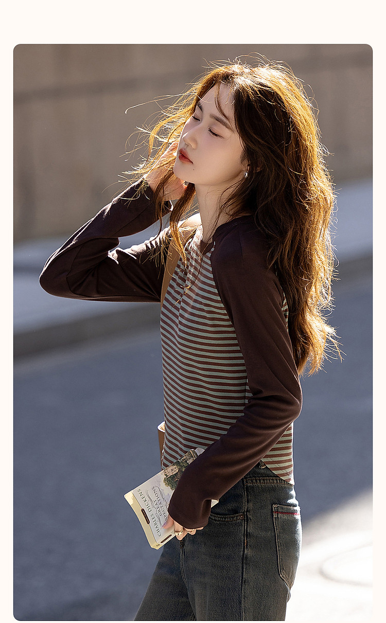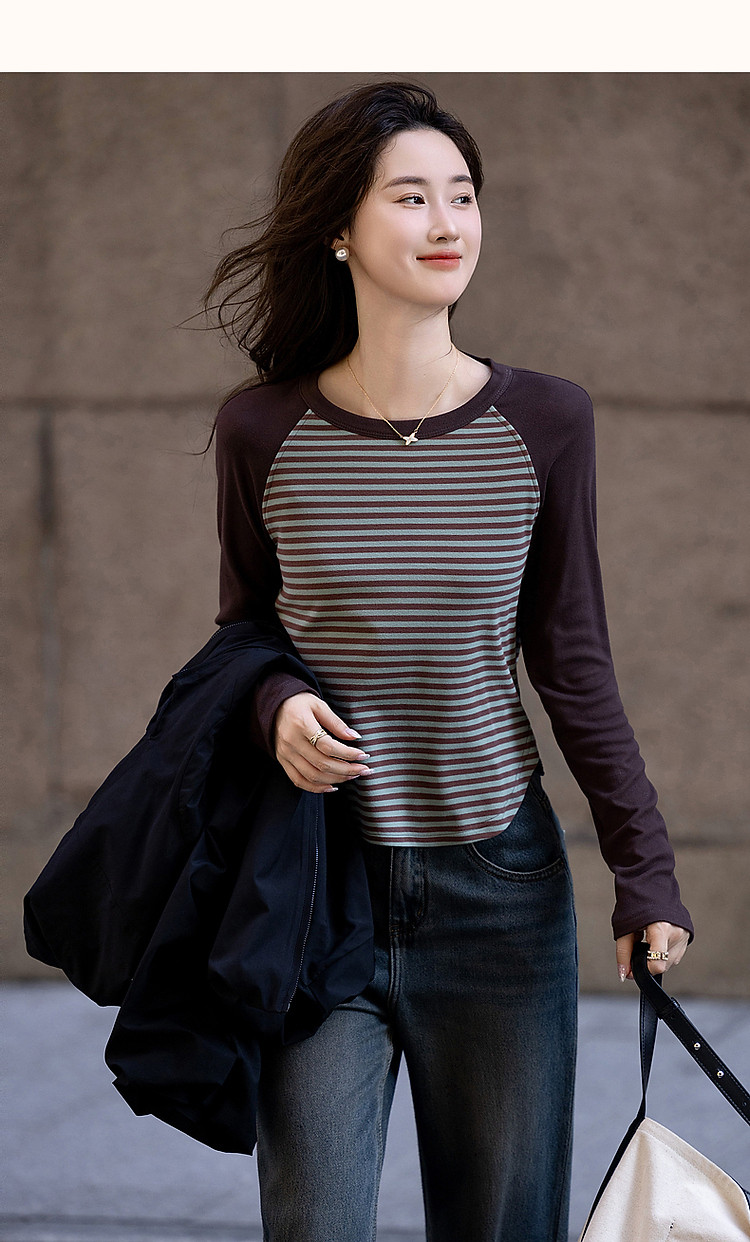 商品名称:【线条美学】春秋美式复古条纹拼色时髦遮肉高频好搭长袖女式t恤 989633
