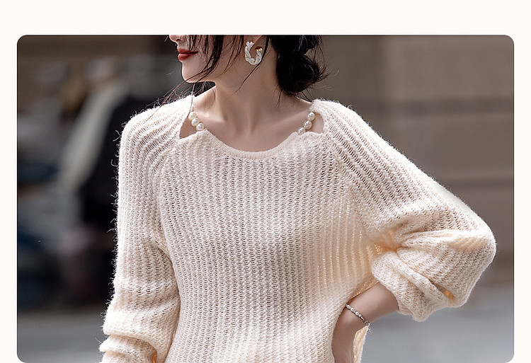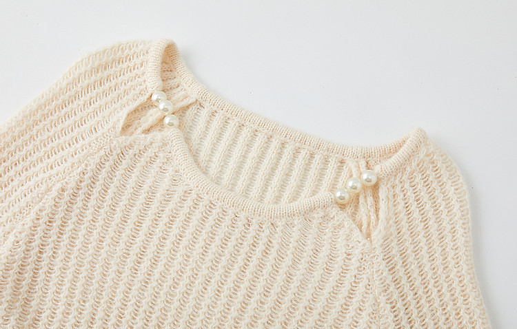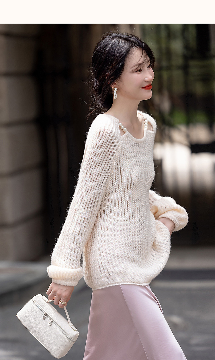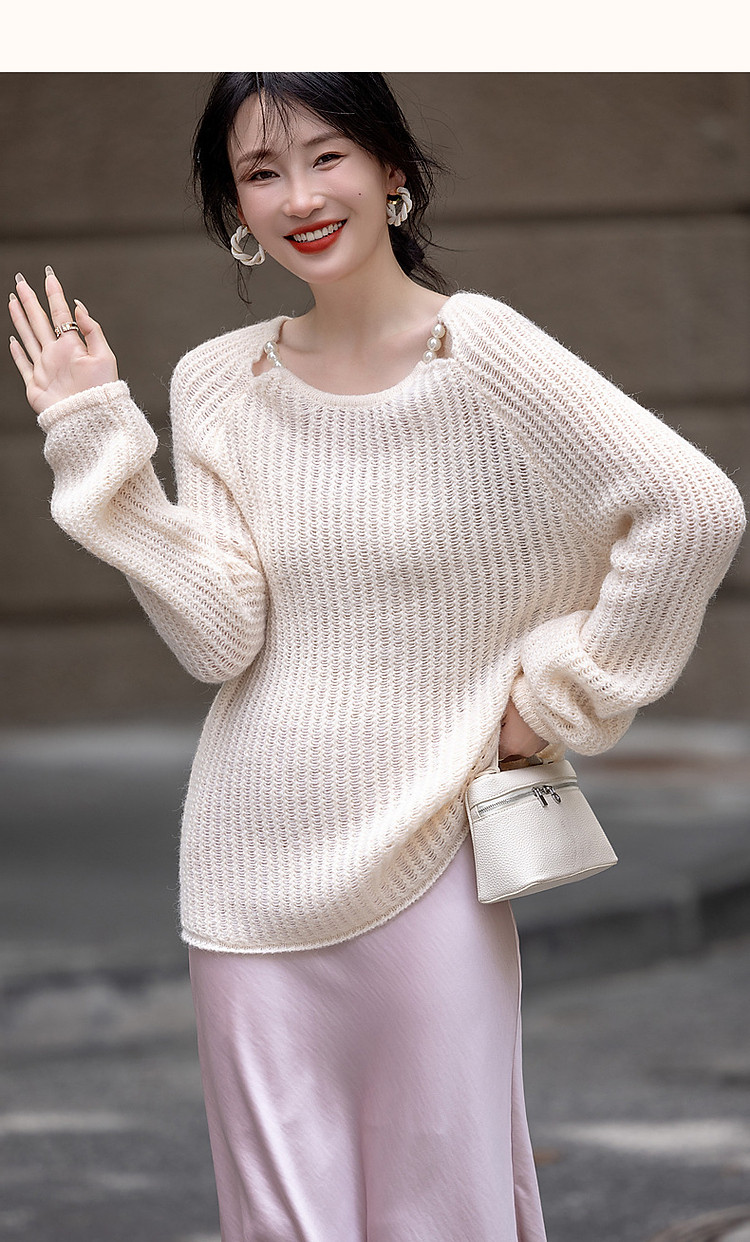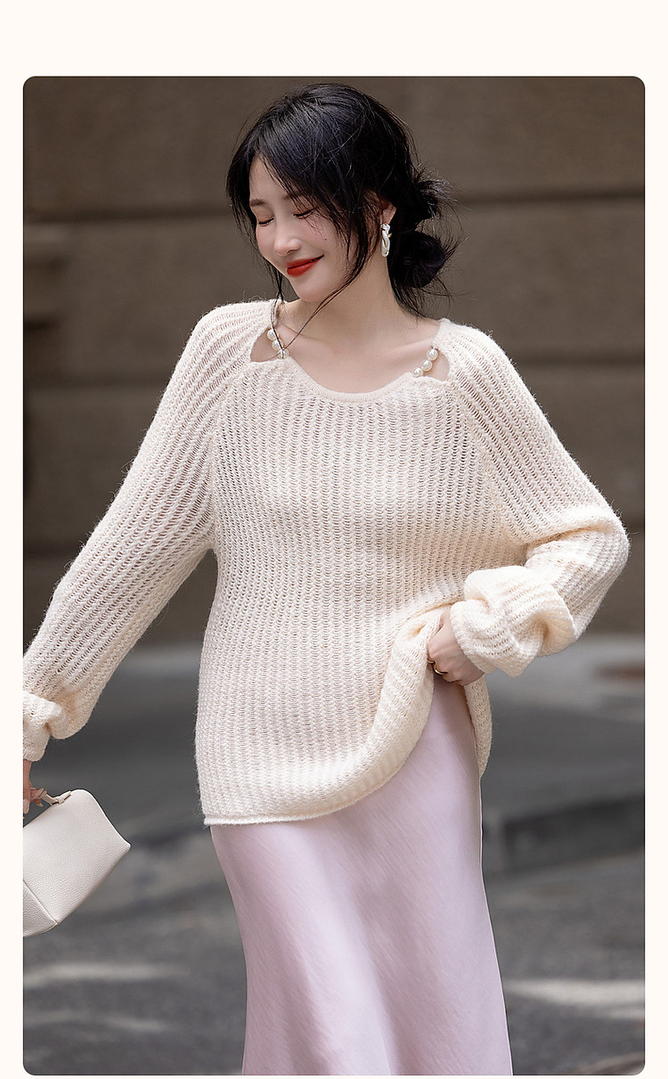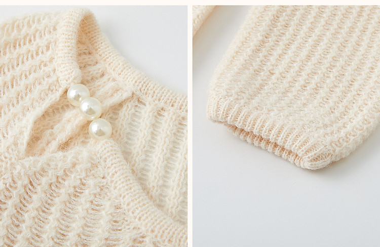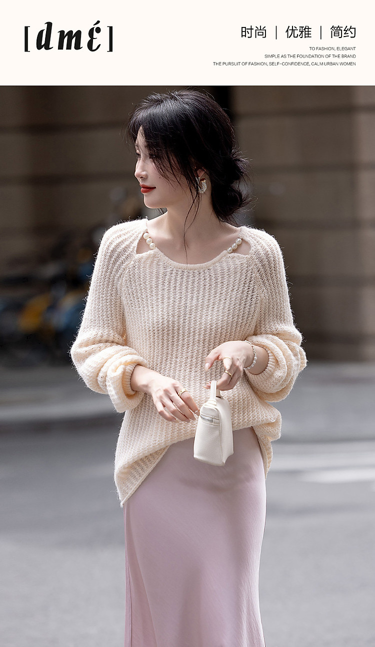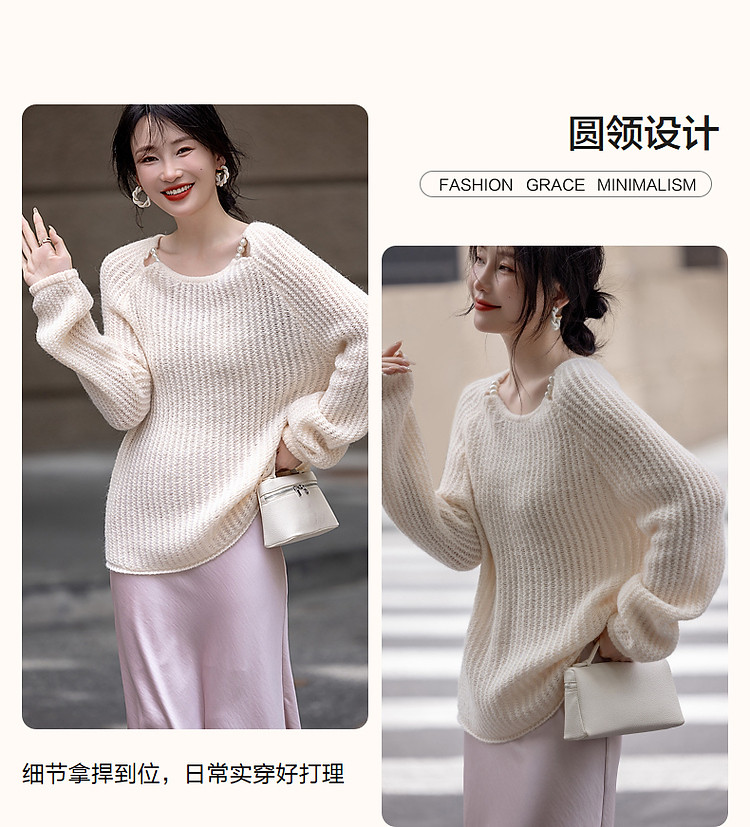 商品名称:【半糖主义】春法式多巴胺珍珠装饰圆领线衫慵懒藏肉针织衫女上衣 618433