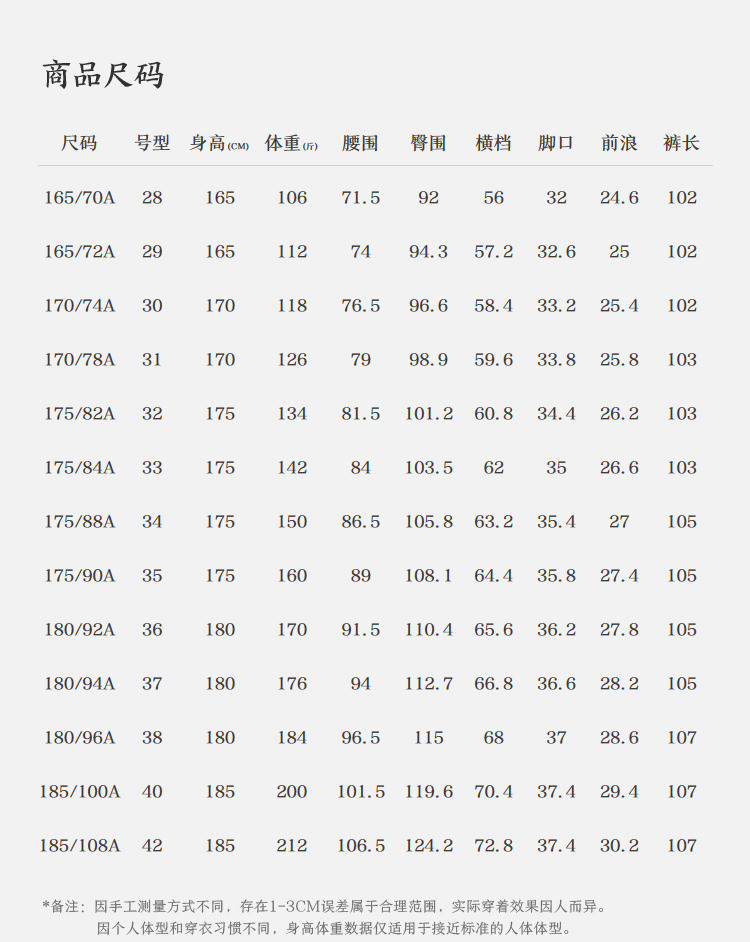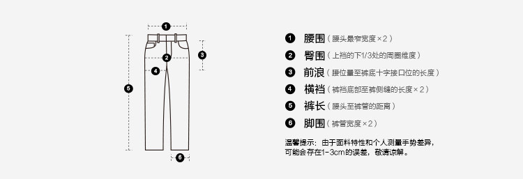 | 尺码 | 腰围(cm) | 裤长(cm) | 前浪(cm) | 臀围(cm) | 号型 |