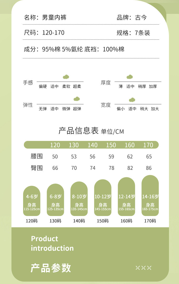 商品名称:7条装【100%纯棉裆】男童内裤儿童平角内裤抑菌短裤中大童 227019