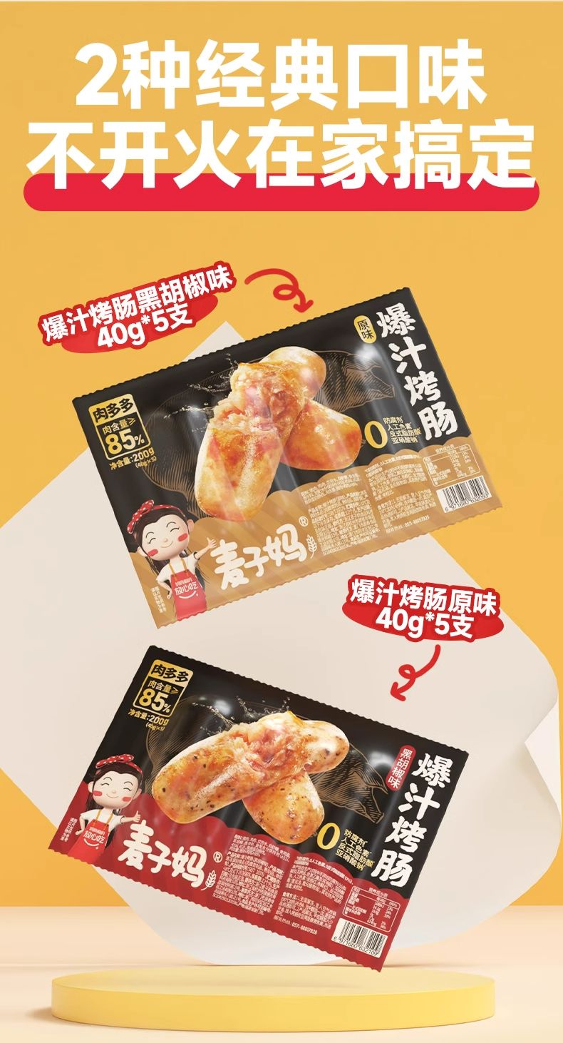 麦子妈爆汁烤肠原味200g*2袋+爆汁烤肠黑胡椒200g*3袋