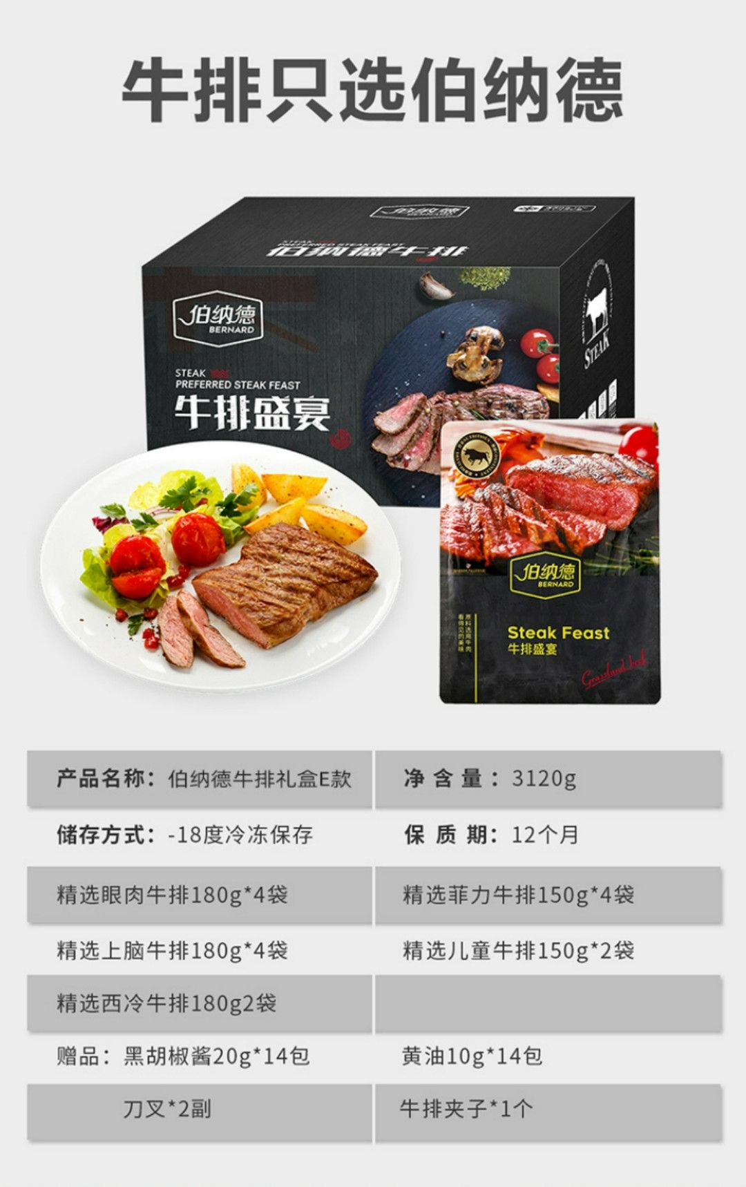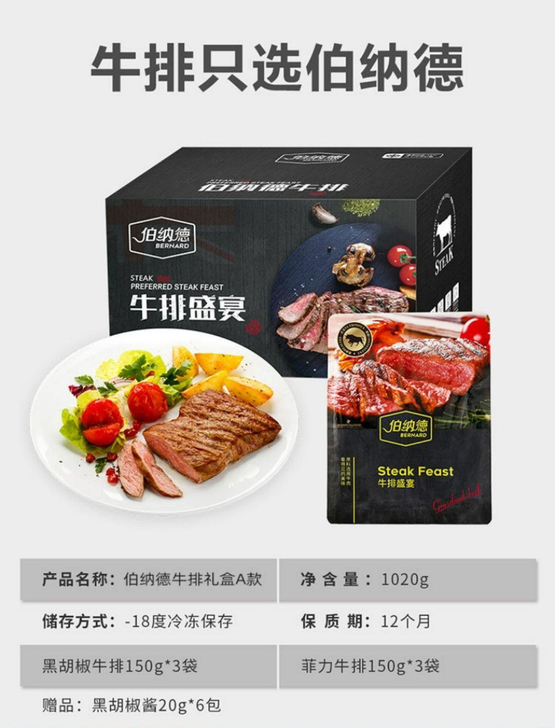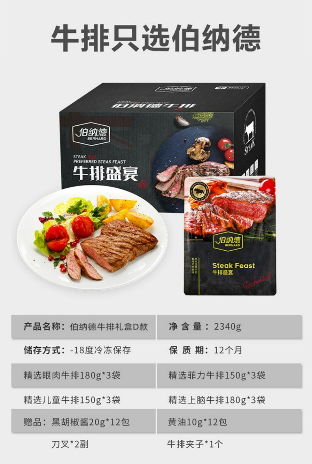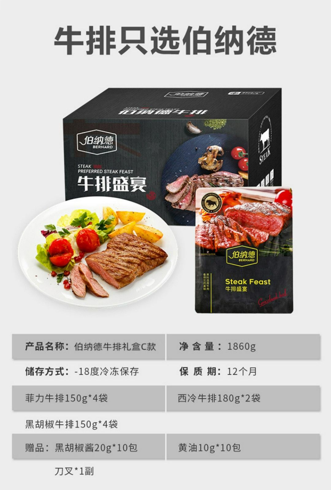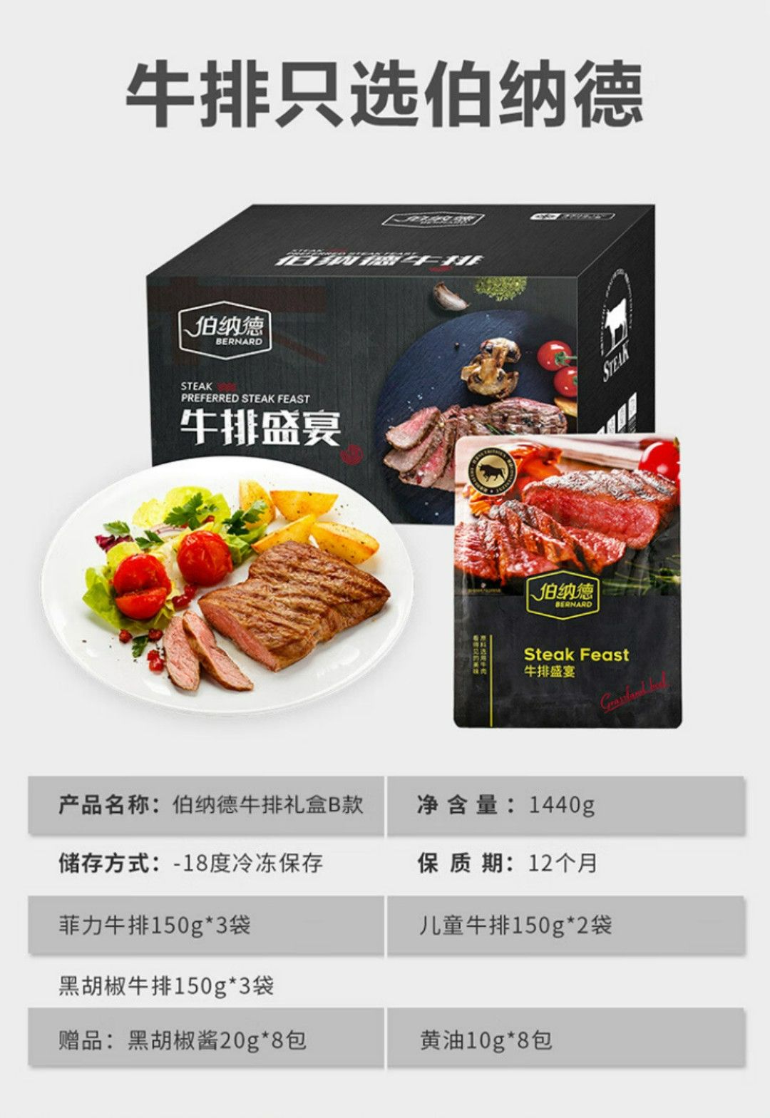 商品名称:伯纳德 牛排礼盒 牛肉整切静腌牛排 儿童西冷黑椒牛扒套餐 顺丰冷链