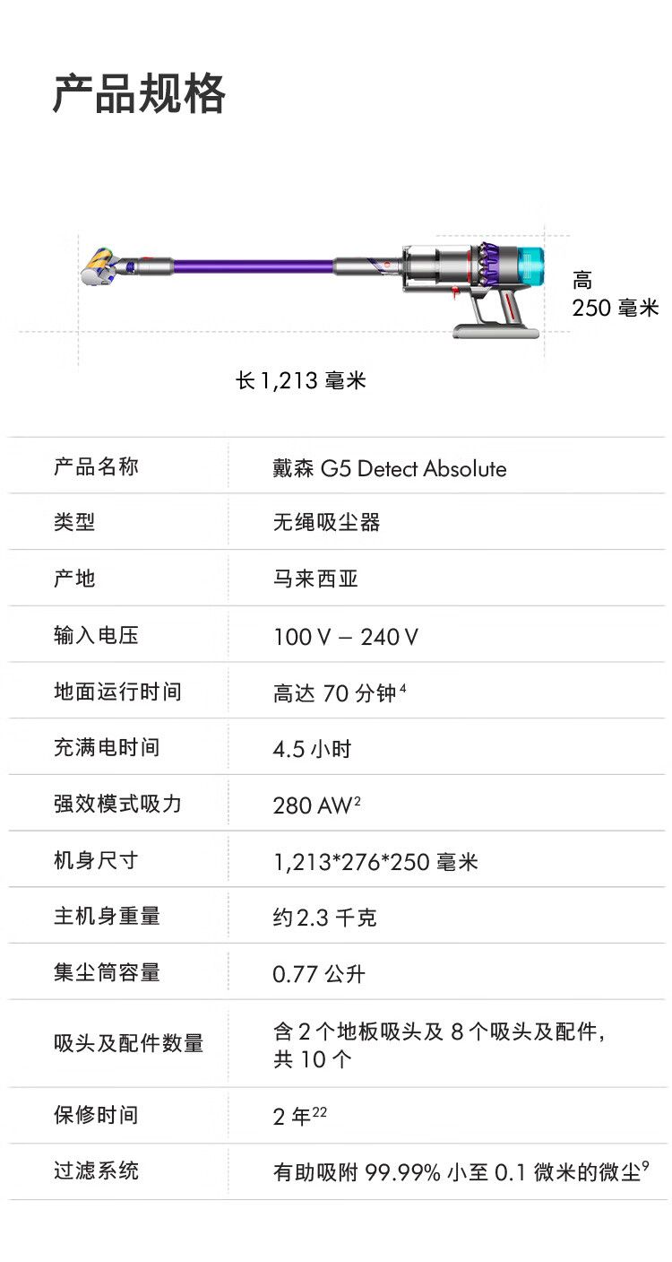 商品名称:戴森(DYSON)G5 Detect Absolute手持无线吸尘器 除螨 宠物 家庭适用