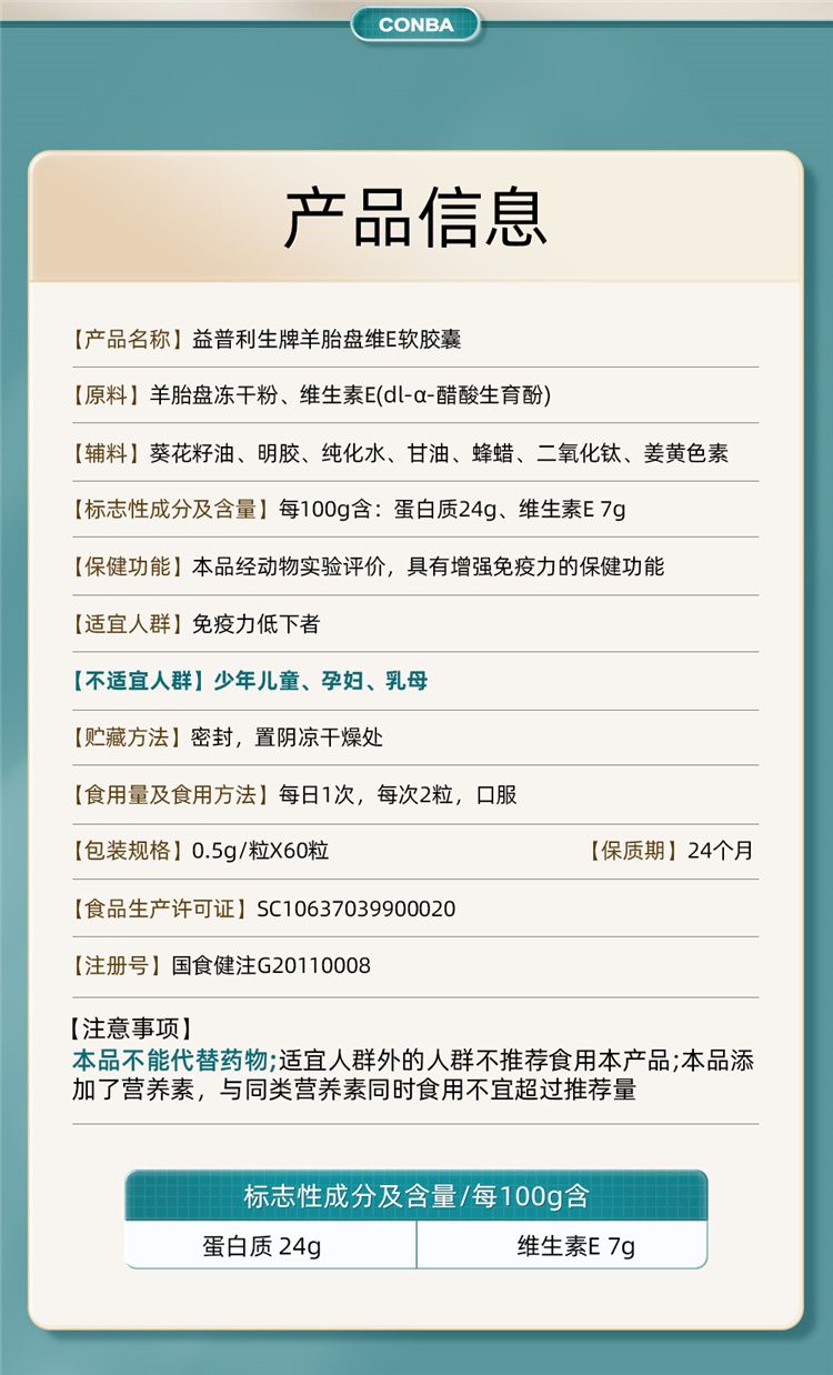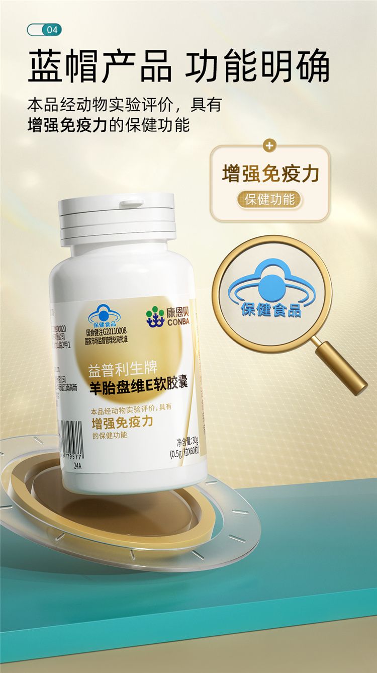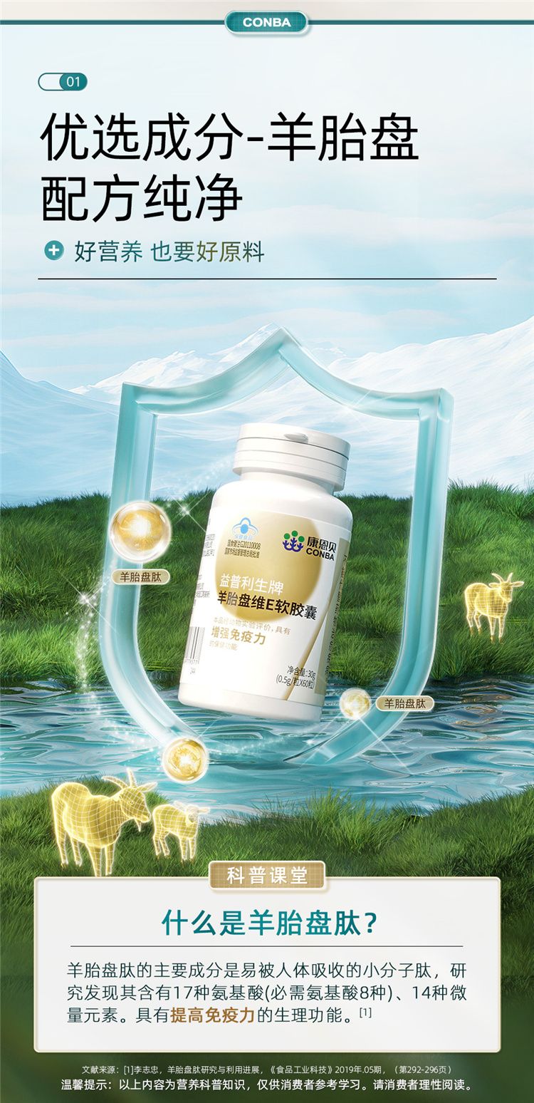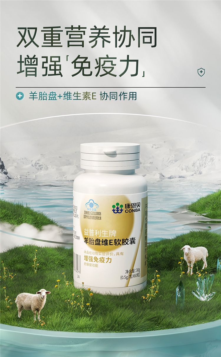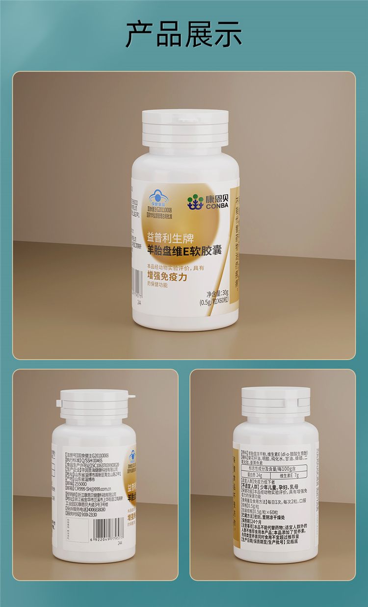商品名称:【三瓶装】康恩贝 益普利生牌羊胎盘维E软胶囊(0.5g*60粒60粒/瓶
