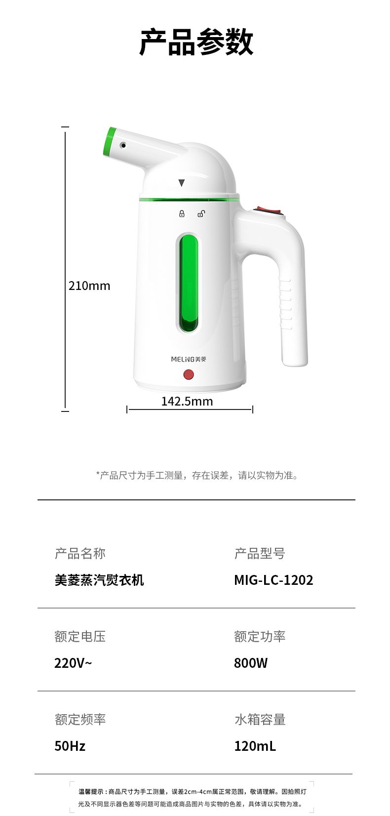 商品名称:美菱(MELING)手持挂烫机蒸汽熨衣锅炉式加热大蒸汽纳米面板五孔蒸汽MIG-LC1202