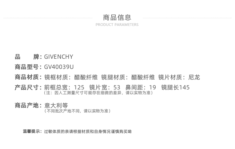 商品名称:Givenchy GV DAY几何形太阳镜男士国际通用版 GV40039U 5396A