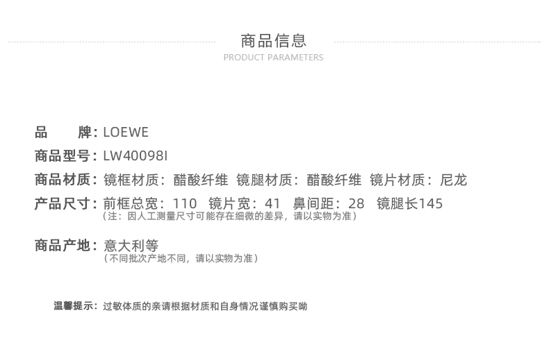 商品名称:Loewe SIGNATURE几何形太阳镜女士国际版 LW40098I 4101A