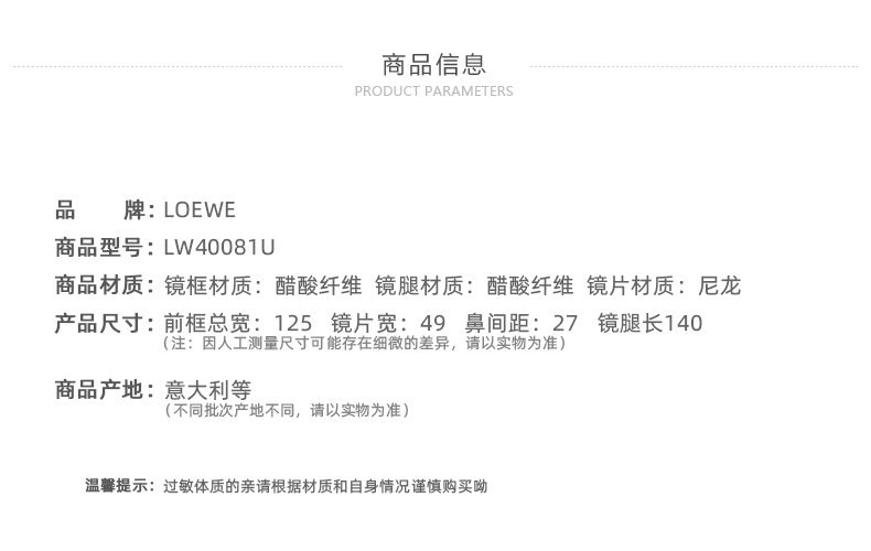 商品名称:Loewe ANAGRAM圆形太阳镜女士国际通用版 LW40081U 4901B