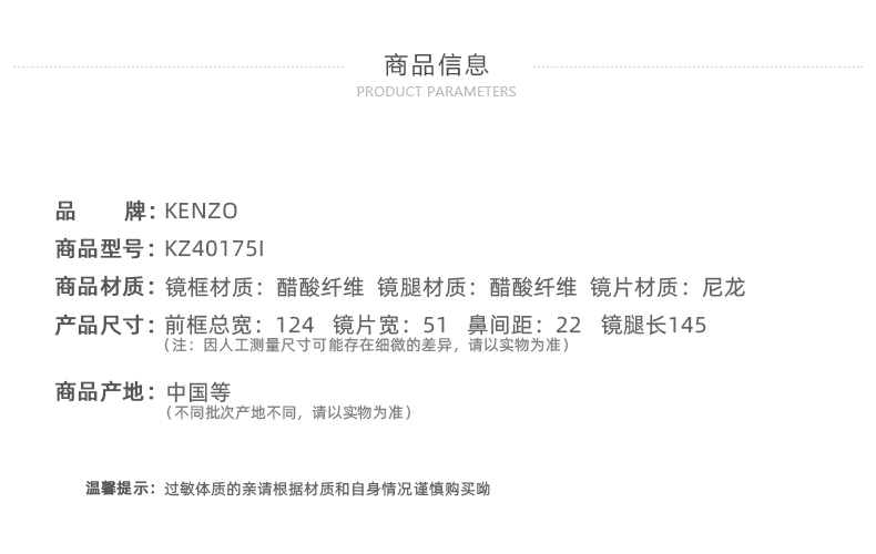 商品名称:Kenzo AKA矩形太阳镜男士国际版 KZ40175I 5101A