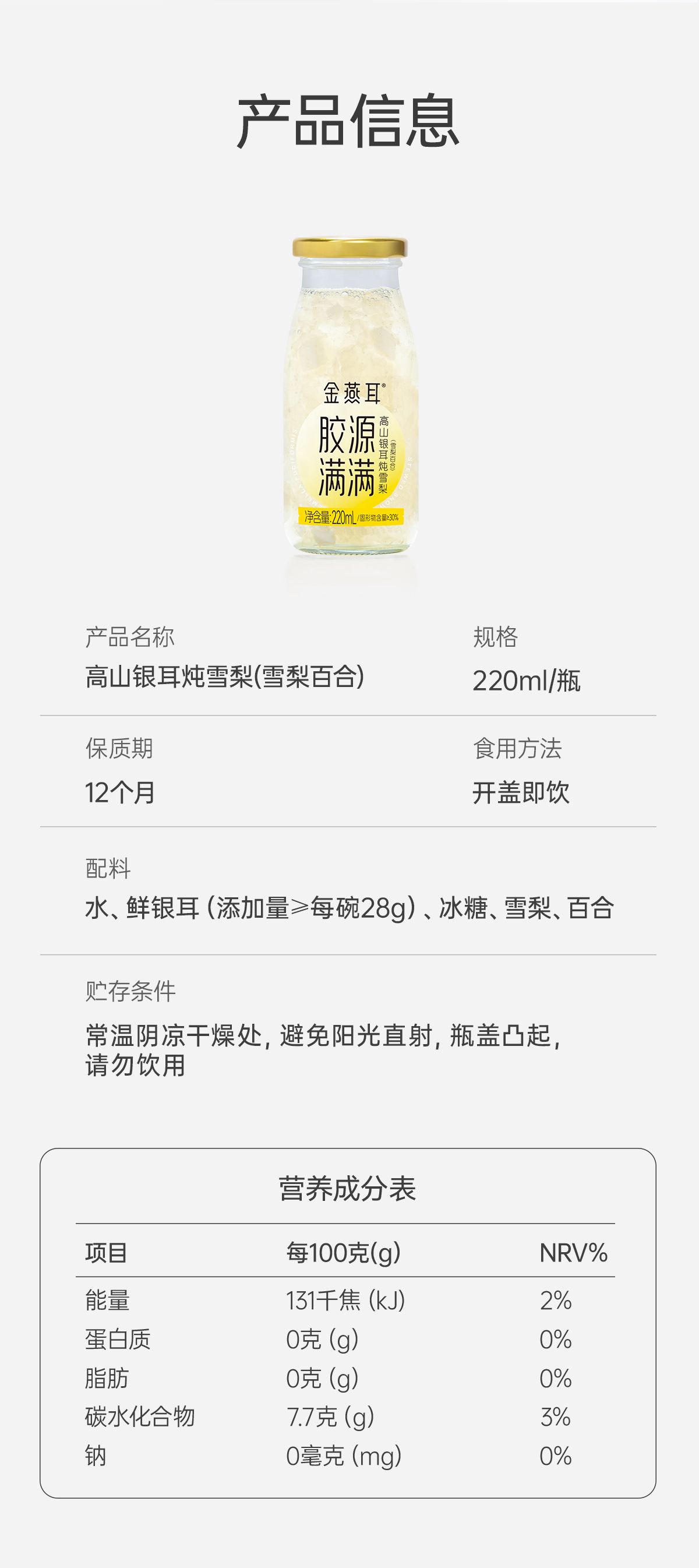 商品名称:金燕耳 胶源满满高山银耳炖雪梨 220mL/瓶*6