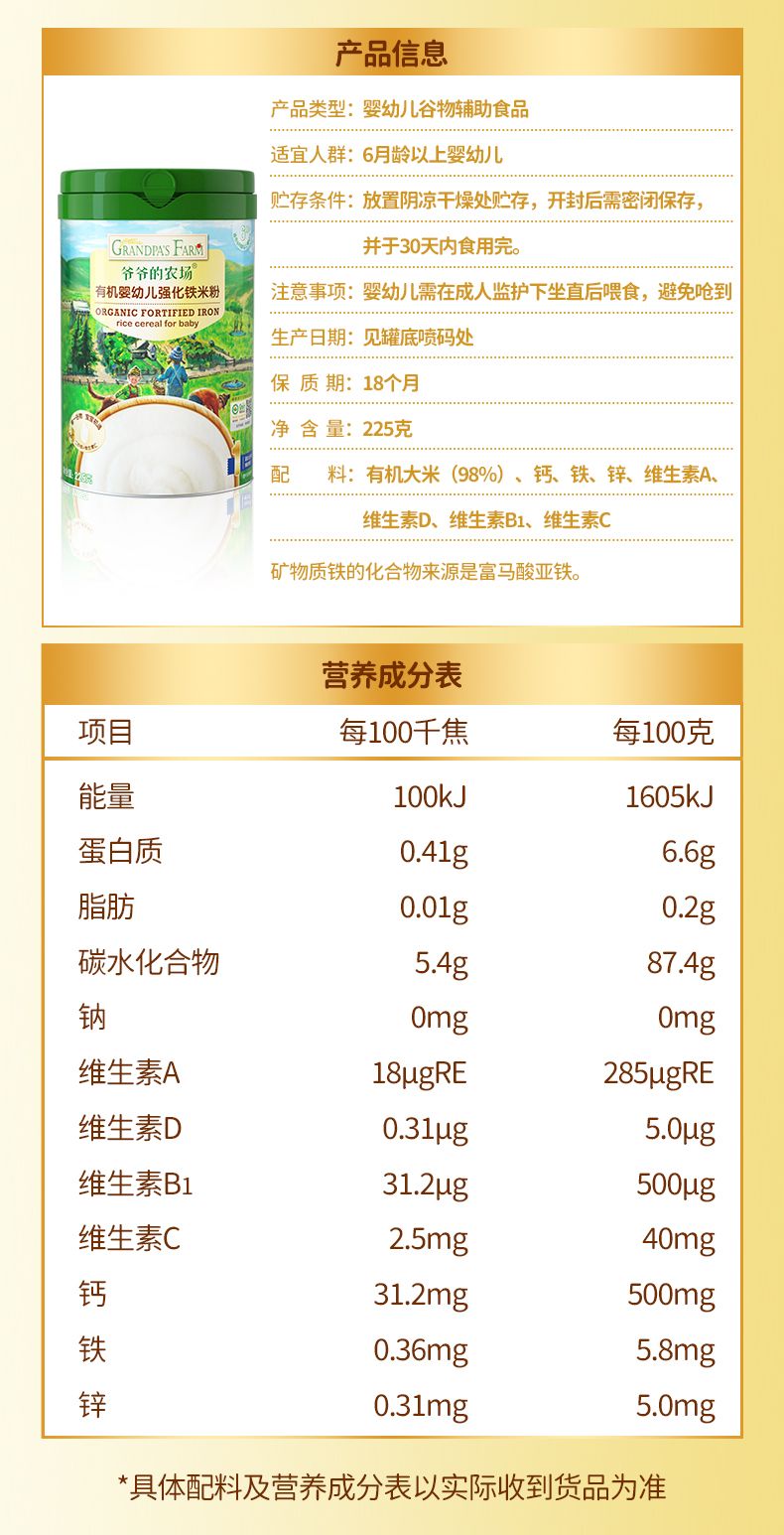 商品名称:爷爷的农场 有机婴幼儿强化铁米粉 225g